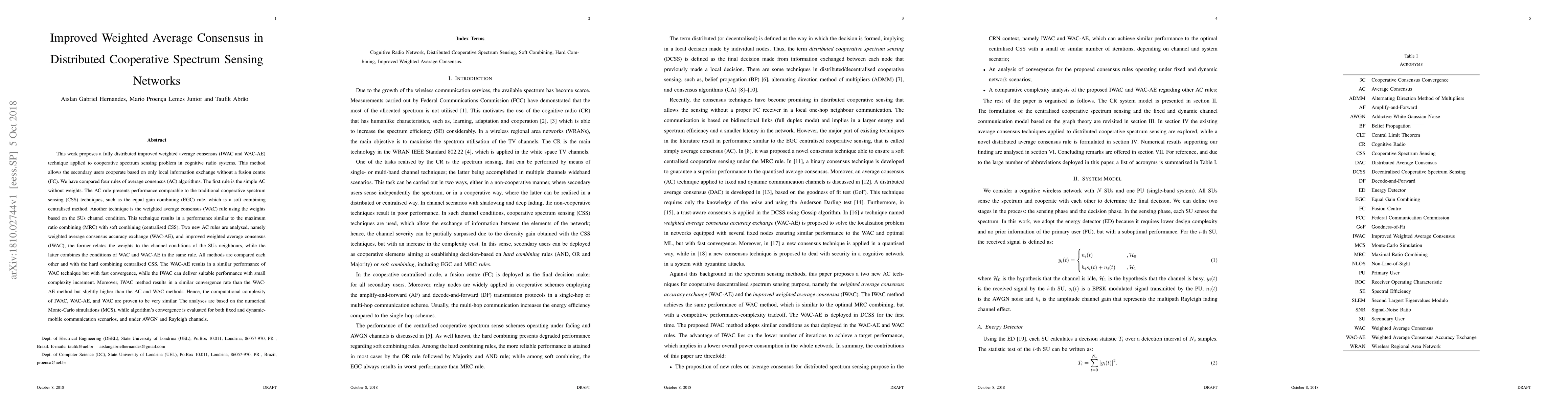 This work proposes a fully distributed improved weighted average consensus (IWAC and WAC-AE) technique applied to cooperative spectrum sensing problem in cognitive radio systems. This method allows the secondary users cooperate based on only local information exchange without a fusion centre (FC). We have compared four rules of average consensus (AC) algorithms. The first rule is the simple AC without weights. The AC rule presents {performance comparable to the traditional cooperative spectrum sensing} (CSS) techniques, such as the equal gain combining (EGC) rule, which is a soft combining centralised method. Another technique is the weighted average consensus (WAC) rule using the weights based on the SUs channel condition. This technique results in a performance similar to the maximum ratio combining (MRC) with soft combining (centralised CSS). Two new AC rules are analysed, namely weighted average consensus accuracy exchange (WAC-AE), and improved weighted average consensus (IWAC); the former relates the weights to the channel conditions of the SUs neighbours, while the latter combines the conditions of WAC and WAC-AE in the same rule. All methods are compared each other and with the hard combining centralised CSS. The WAC-AE results in a similar performance of WAC technique but with fast convergence, while the IWAC can deliver suitable performance with small complexity increment{. Moreover, IWAC method results in a similar convergence rate than the WAC-AE method but slightly higher than the AC and WAC methods}. Hence, the computational complexity of IWAC, WAC-AE, and WAC are proven to be very similar. The analyses are based on the numerical Monte-Carlo simulations (MCS), while algorithm's convergence is evaluated for both fixed and dynamic-mobile communication scenarios, and under AWGN and Rayleigh channels.