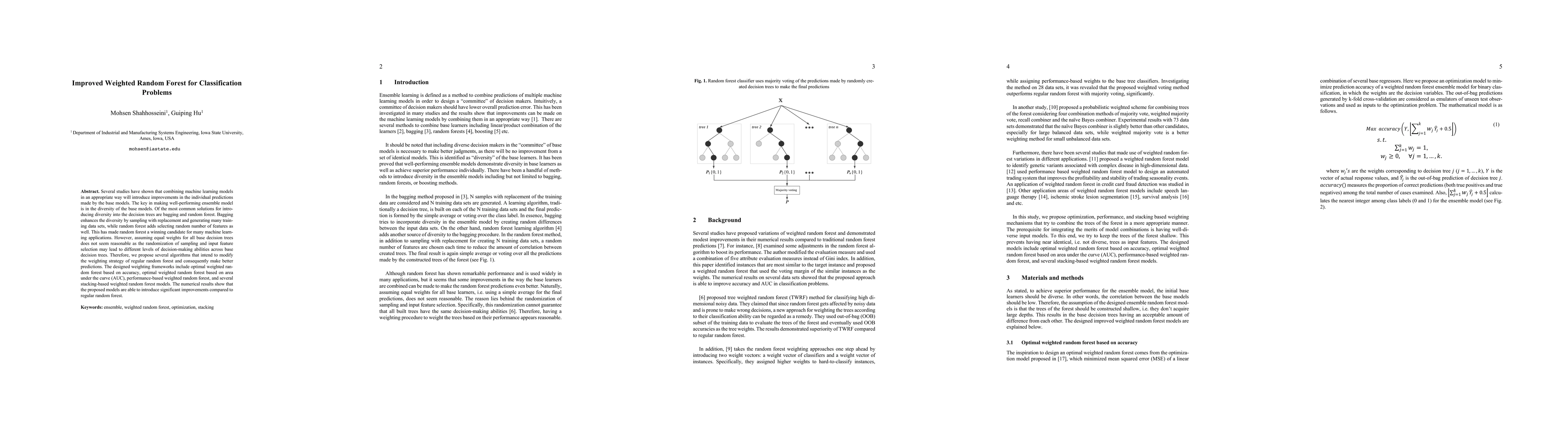 This paper proposes improved weighted random forest algorithms to enhance classification performance by adjusting the weights of base decision trees based on accuracy, AUC, and performance metrics. The results demonstrate significant improvements over standard random forest methods.