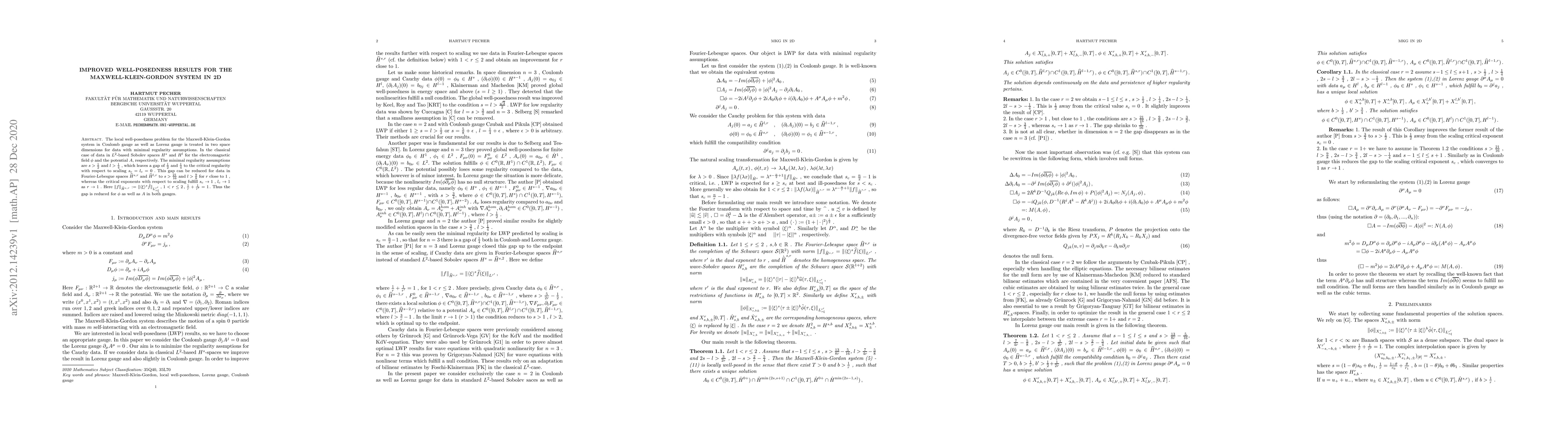 The local well-posedness problem for the Maxwell-Klein-Gordon system in Coulomb gauge as well as Lorenz gauge is treated in two space dimensions for data with minimal regularity assumptions. In the classical case of data in $L^2$-based Sobolev spaces $H^s$ and $H^l$ for the electromagnetic field $\phi$ and the potential $A$, respectively. The minimal regularity assumptions are $s > \frac{1}{2}$ and $l > \frac{1}{4}$ , which leaves a gap of $\frac{1}{2}$ and $\frac{1}{4}$ to the critical regularity with respect to scaling $s_c = l_c =0$ . This gap can be reduced for data in Fourier-Lebesgue spaces $\widehat{H}^{s,r}$ and $\widehat{H}^{l,r}$ to $s> \frac{21}{16}$ and $l > \frac{9}{8}$ for $r$ close to $1$ , whereas the critical exponents with respect to scaling fulfill $s_c \to 1$ , $ l_c \to 1 $ as $r \to 1$ . Here $\|f\|_{\widehat{H}^{s,r}} := \| \langle \xi \rangle^s \tilde{f}\|_{L^{r'}_{\tau \xi}} \, , \, 1 < r \le 2 \, , \, \frac{1}{r}+\frac{1}{r'} = 1 \, . $ Thus the gap is reduced for $\phi$ as well as $A$ in both gauges.