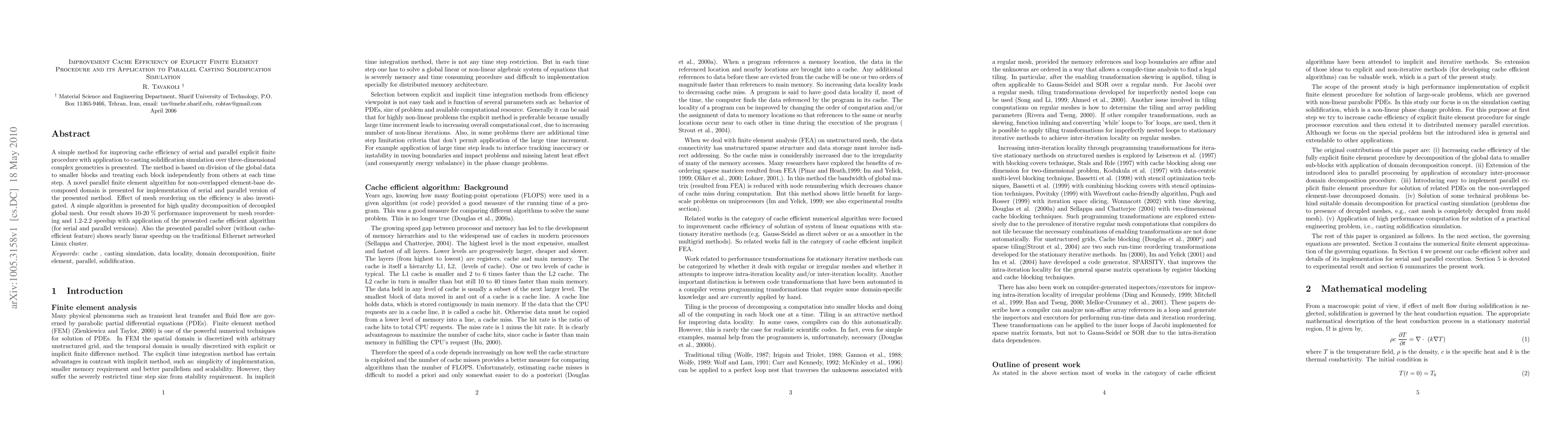 A simple method for improving cache efficiency of serial and parallel explicit finite procedure with application to casting solidification simulation over three-dimensional complex geometries is presented. The method is based on division of the global data to smaller blocks and treating each block independently from others at each time step. A novel parallel finite element algorithm for non-overlapped element-base decomposed domain is presented for implementation of serial and parallel version of the presented method. Effect of mesh reordering on the efficiency is also investigated. A simple algorithm is presented for high quality decomposition of decoupled global mesh. Our result shows 10-20 \% performance improvement by mesh reordering and 1.2-2.2 speedup with application of the presented cache efficient algorithm (for serial and parallel versions). Also the presented parallel solver (without cache-efficient feature) shows nearly linear speedup on the traditional Ethernet networked Linux cluster.