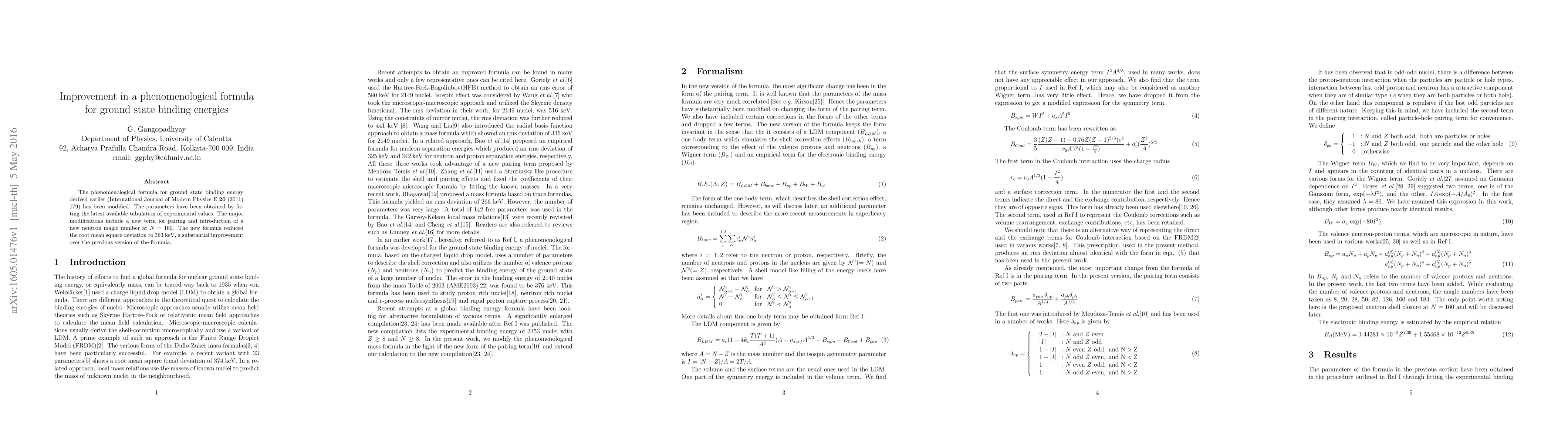 The paper enhances a previous phenomenological formula for ground state binding energies by refining parameters using current experimental data. Key changes include a new pairing term and recognition of a neutron magic number at N=160, significantly decreasing the root mean square deviation to 363 keV.
