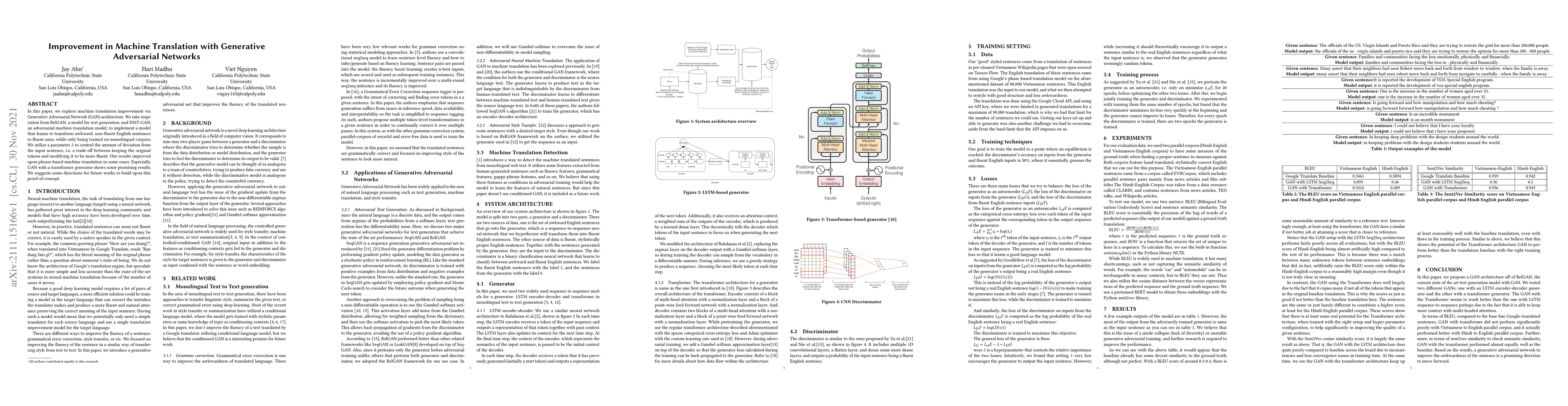 This paper explores using Generative Adversarial Networks to improve machine translation, particularly in transforming awkward English sentences into fluent ones with minimal training data.