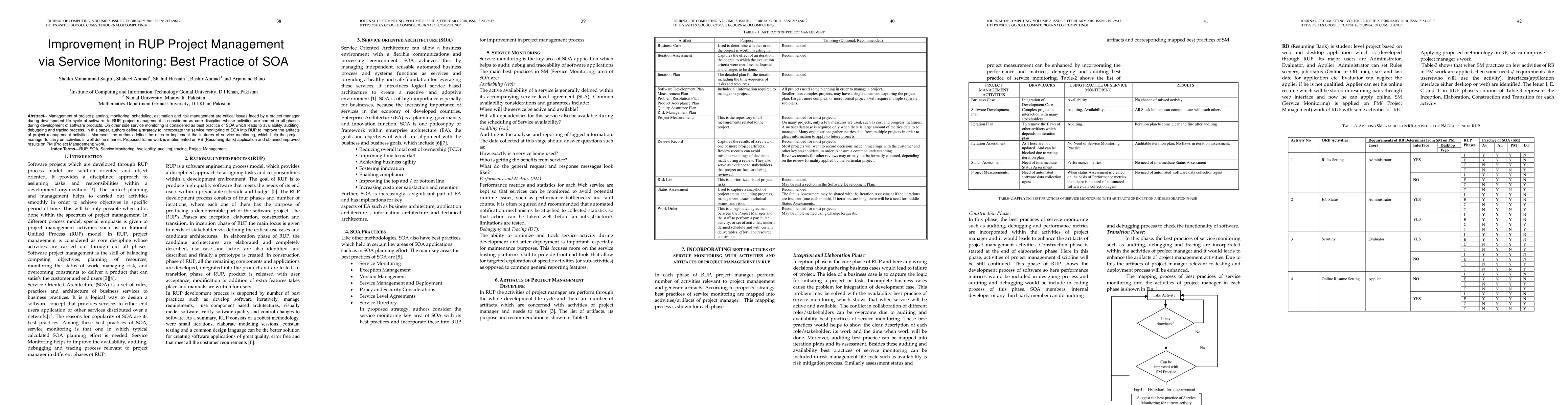 This paper proposes a strategy to integrate SOA's service monitoring into RUP project management to enhance project planning, scheduling, and risk management. The authors define implementation rules for service monitoring features, demonstrating improved project management outcomes through a case study on the RB application.