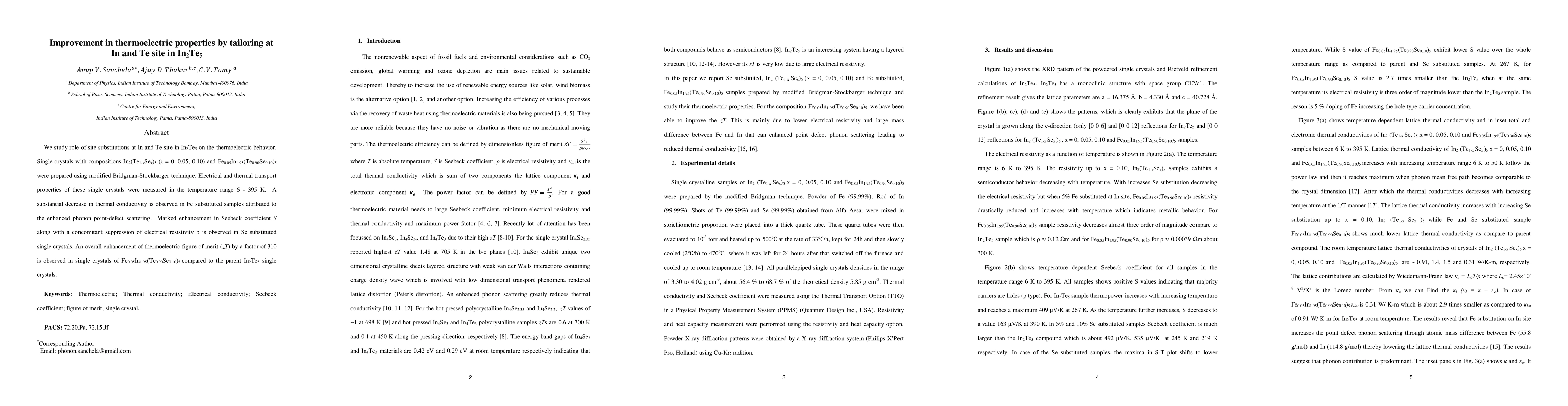 We study role of site substitutions at In and Te site in In2Te5 on the thermoelectric behavior. Single crystals with compositions In2(Te1-xSex)5 (x = 0, 0.05, 0.10) and Fe0.05In1.95(Te0.90Se0.10)5 were prepared using modified Bridgman-Stockbarger technique. Electrical and thermal transport properties of these single crystals were measured in the temperature range 6 - 395 K. A substantial decrease in thermal conductivity is observed in Fe substituted samples attributed to the enhanced phonon point-defect scattering. Marked enhancement in Seebeck coefficient S along with a concomitant suppression of electrical resistivity \r{ho} is observed in Se substituted single crystals. An overall enhancement of thermoelectric figure of merit (zT) by a factor of 310 is observed in single crystals of Fe0.05In1.95(Te0.90Se0.10)5 compared to the parent In2Te5 single crystals.