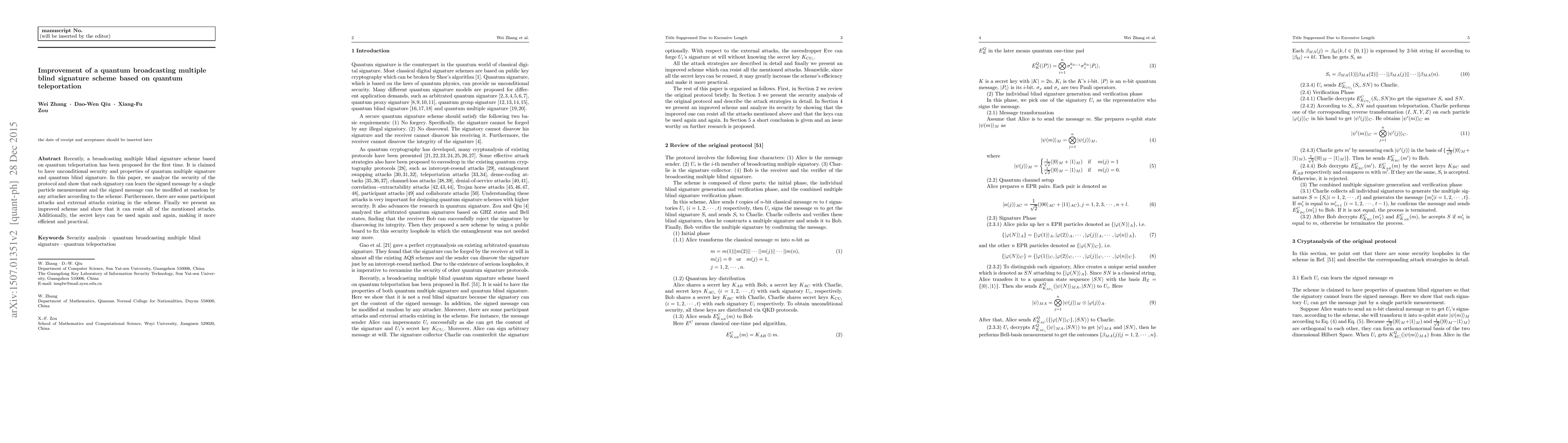 This paper analyzes a quantum teleportation-based broadcasting multiple blind signature scheme, identifying security flaws such as message leakage and modification, and participant attacks. An improved protocol is proposed that addresses these issues, enhances efficiency by reusing secret keys, and resists all identified attacks.