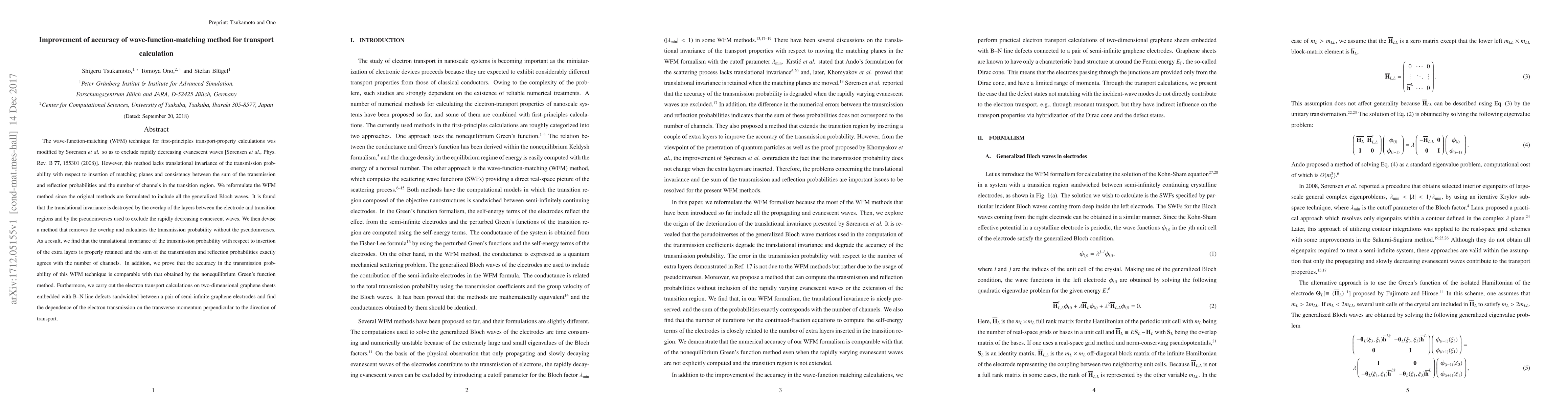 The wave-function-matching (WFM) technique for first-principles transport-property calculations was modified by S\o{}rensen {\it et al.} so as to exclude rapidly decreasing evanescent waves [S\o{}rensen {\it et al.}, Phys. Rev. B {\bf 77}, 155301 (2008)]. However, this method lacks translational invariance of the transmission probability with respect to insertion of matching planes and consistency between the sum of the transmission and reflection probabilities and the number of channels in the transition region. We reformulate the WFM method since the original methods are formulated to include all the generalized Bloch waves. It is found that the translational invariance is destroyed by the overlap of the layers between the electrode and transition regions and by the pseudoinverses used to exclude the rapidly decreasing evanescent waves. We then devise a method that removes the overlap and calculates the transmission probability without the pseudoinverses. As a result, we find that the translational invariance of the transmission probability with respect to insertion of the extra layers is properly retained and the sum of the transmission and reflection probabilities exactly agrees with the number of channels. In addition, we prove that the accuracy in the transmission probability of this WFM technique is comparable with that obtained by the nonequilibrium Green's function method. Furthermore, we carry out the electron transport calculations on two-dimensional graphene sheets embedded with B--N line defects sandwiched between a pair of semi-infinite graphene electrodes and find the dependence of the electron transmission on the transverse momentum perpendicular to the direction of transport.