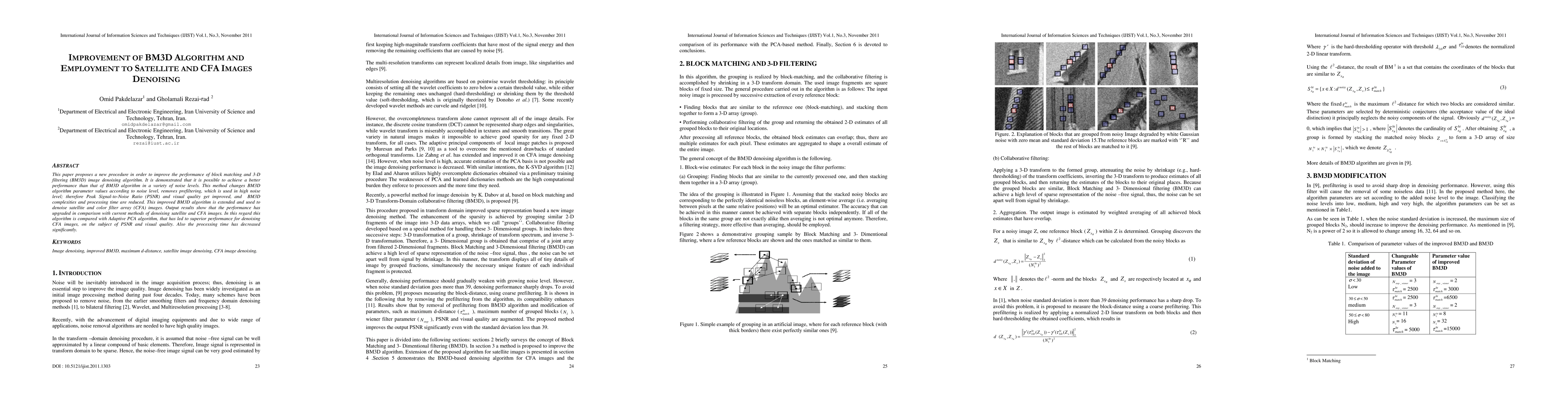 This paper enhances the BM3D algorithm for better noise reduction, achieving higher PSNR and visual quality while reducing complexity and processing time. The improved algorithm is applied to satellite and CFA images, demonstrating superior performance compared to existing methods.