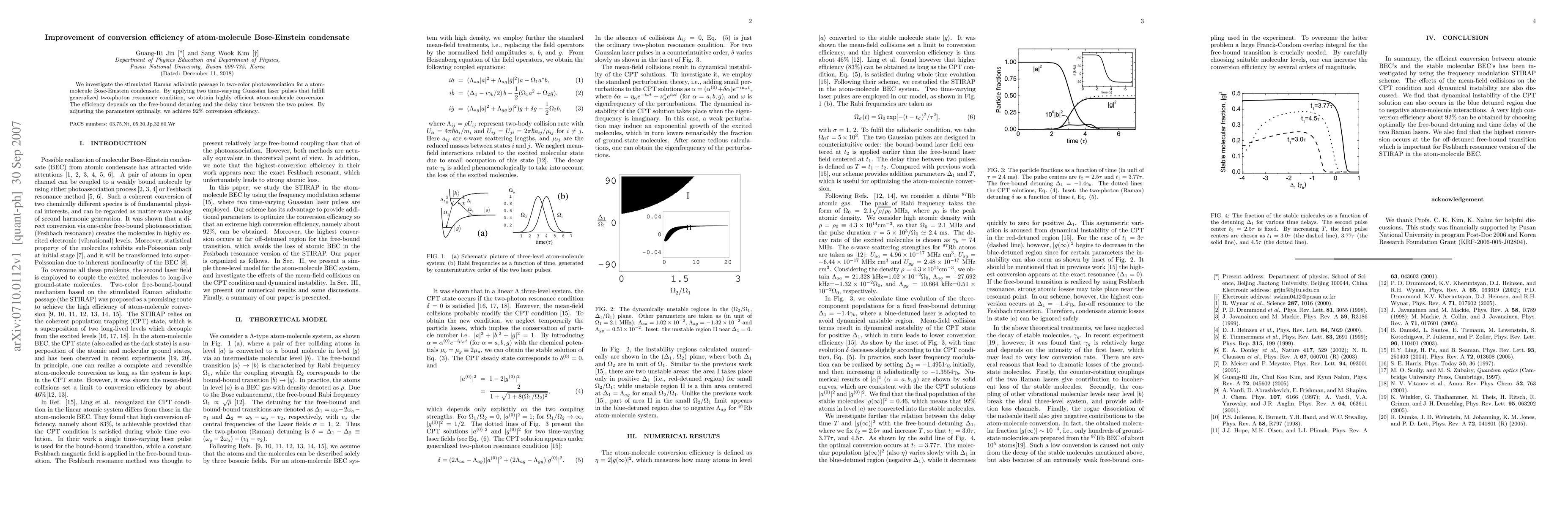 This study optimizes the conversion efficiency of atom-molecule transitions in a Bose-Einstein condensate using stimulated Raman adiabatic passage with two-color photoassociation. Achieving 92% efficiency relies on precise control of free-bound detuning and pulse delay time.