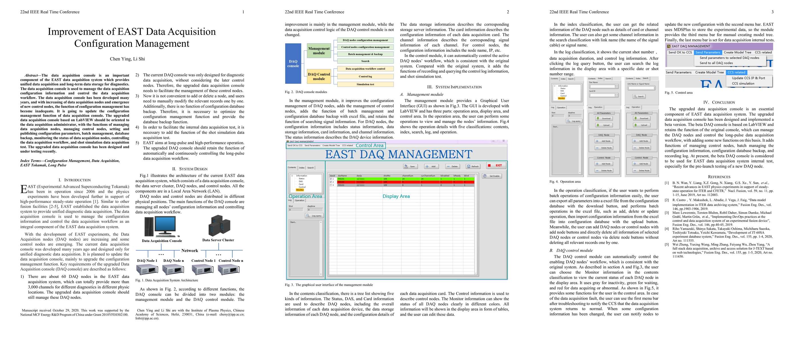 The paper discusses the enhancement of the EAST data acquisition console to better manage configuration information and control workflows, with a focus on updating its configuration management function using LabVIEW. The upgraded console aims to improve management of data acquisition and control nodes, and is currently under testing.