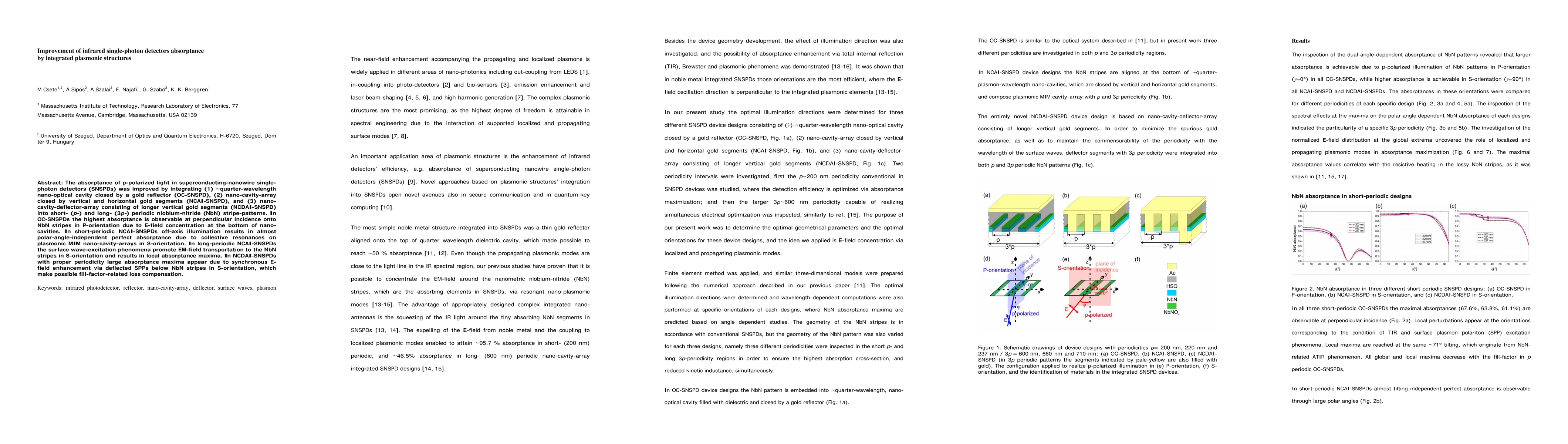 The absorptance of p-polarized light in superconducting-nanowire single-photon detectors (SNSPDs) was improved by integrating (1) ~quarter-wavelength nano-optical cavity closed by a gold reflector (OC-SNSPD), (2) nano-cavity-array closed by vertical and horizontal gold segments (NCAI-SNSPD), and (3) nano-cavity-deflector-array consisting of longer vertical gold segments (NCDAI-SNSPD) into short- (p-) and long- (3p-) periodic niobium-nitride (NbN) stripe-patterns. In OC-SNSPDs the highest absorptance is observable at perpendicular incidence onto NbN stripes in P-orientation due to E-field concentration at the bottom of nano- cavities. In short-periodic NCAI-SNSPDs off-axis illumination results in almost polar-angle-independent perfect absorptance due to collective resonances on plasmonic MIM nano-cavity-arrays in S-orientation. In long-periodic NCAI-SNSPDs the surface wave-excitation phenomena promote EM-field transportation to the NbN stripes in S-orientation and results in local absorptance maxima. In NCDAI-SNSPDs with proper periodicity large absorptance maxima appear due to synchronous E-field enhancement via deflected SPPs below NbN stripes in S-orientation, which make possible fill-factor-related loss compensation.
