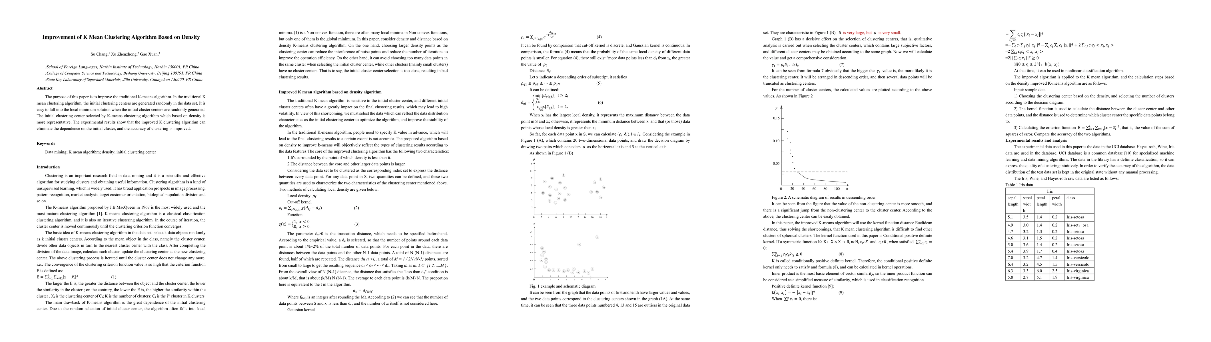 This paper proposes an enhanced K-means clustering algorithm based on density to improve initial cluster center selection, reducing reliance on random initialization and increasing clustering accuracy. Experimental results demonstrate the effectiveness of the new approach in achieving better clustering performance.