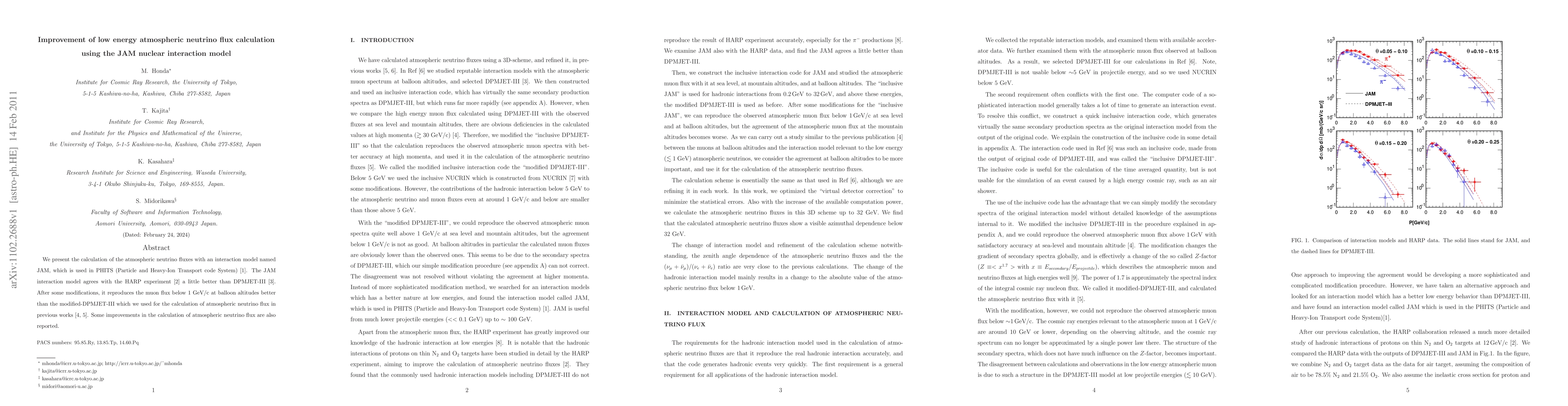This paper presents an improved calculation of low energy atmospheric neutrino flux using the JAM nuclear interaction model in the PHITS simulation code, which shows better agreement with the HARP experiment and more accurate muon flux predictions below 1 GeV/c compared to previous models. The study reports enhancements in the atmospheric neutrino flux calculation.