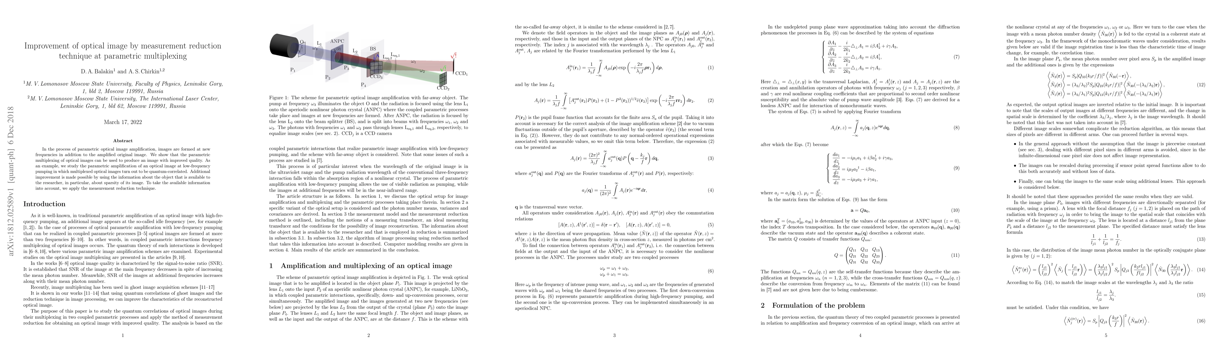 In the process of parametric optical image amplification, images are formed at new frequencies in addition to the amplified original image. We show that the parametric multiplexing of optical images can be used to produce an image with improved quality. As an example, we study the parametric amplification of an optical image at low-frequency pumping in which multiplexed optical images turn out to be quantum-correlated. Additional improvement is made possible by using the information about the object that is available to the researcher, in particular, about sparsity of its image. To take the available information into account, we apply the measurement reduction technique.
