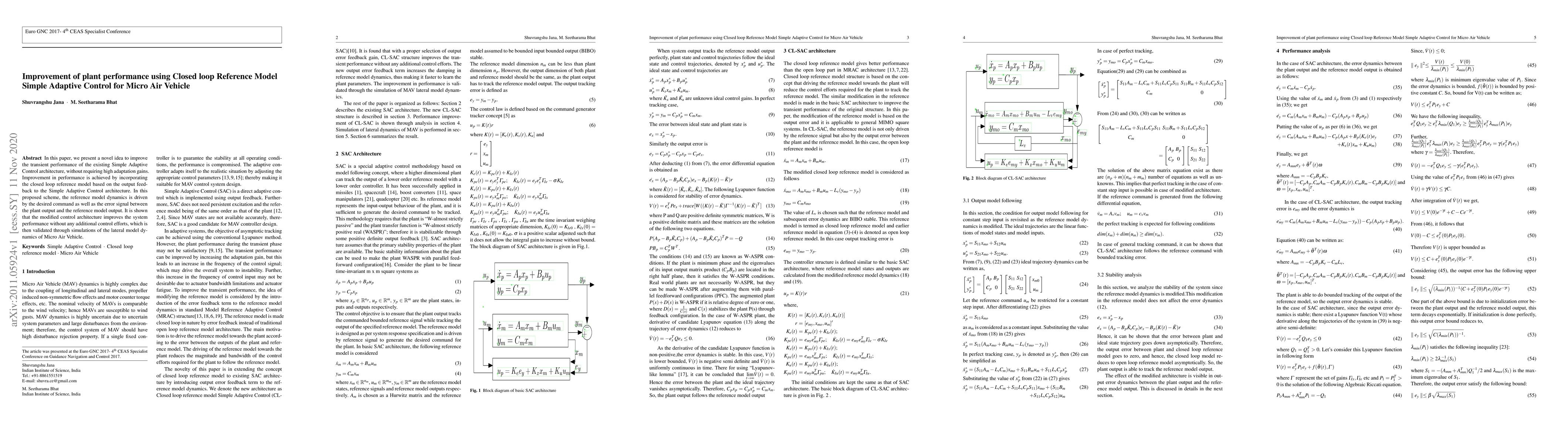 In this paper, we present a novel idea to improve the transient performance of the existing Simple Adaptive Control architecture, without requiring high adaptation gains. Improvement in performance is achieved by incorporating the closed loop reference model based on the output feedback to the Simple Adaptive Control architecture. In this proposed scheme, the reference model dynamics is driven by the desired command as well as the error signal between the plant output and the reference model output. It is shown that the modified control architecture improves the system performance without any additional control efforts, which is then validated through simulations of the lateral model dynamics of Micro Air Vehicle.