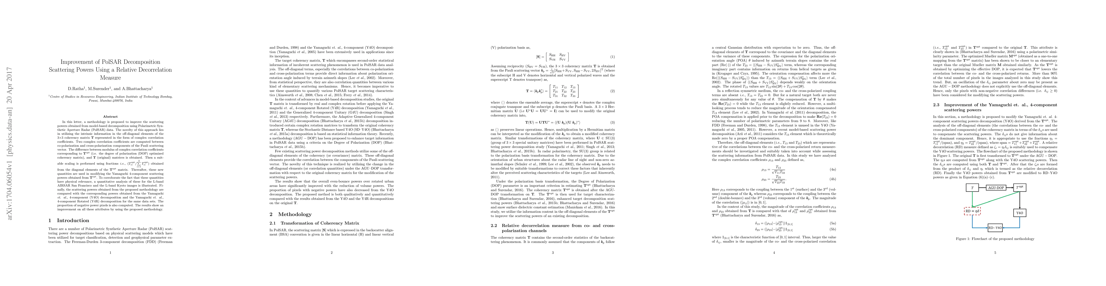 In this letter, a methodology is proposed to improve the scattering powers obtained from model-based decomposition using Polarimetric Synthetic Aperture Radar (PolSAR) data. The novelty of this approach lies in utilizing the intrinsic information in the off-diagonal elements of the 3$\times$3 coherency matrix $\mathbf{T}$ represented in the form of complex correlation coefficients. Two complex correlation coefficients are computed between co-polarization and cross-polarization components of the Pauli scattering vector. The difference between modulus of complex correlation coefficients corresponding to $\mathbf{T}^{\mathrm{opt}}$ (i.e. the degree of polarization (DOP) optimized coherency matrix), and $\mathbf{T}$ (original) matrices is obtained. Then a suitable scaling is performed using fractions \emph{i.e.,} $(T_{ii}^{\mathrm{opt}}/\sum\limits_{i=1}^{3}T_{ii}^{\mathrm{opt}})$ obtained from the diagonal elements of the $\mathbf{T}^{\mathrm{opt}}$ matrix. Thereafter, these new quantities are used in modifying the Yamaguchi 4-component scattering powers obtained from $\mathbf{T}^{\mathrm{opt}}$. To corroborate the fact that these quantities have physical relevance, a quantitative analysis of these for the L-band AIRSAR San Francisco and the L-band Kyoto images is illustrated. Finally, the scattering powers obtained from the proposed methodology are compared with the corresponding powers obtained from the Yamaguchi \emph{et. al.,} 4-component (Y4O) decomposition and the Yamaguchi \emph{et. al.,} 4-component Rotated (Y4R) decomposition for the same data sets. The proportion of negative power pixels is also computed. The results show an improvement on all these attributes by using the proposed methodology.