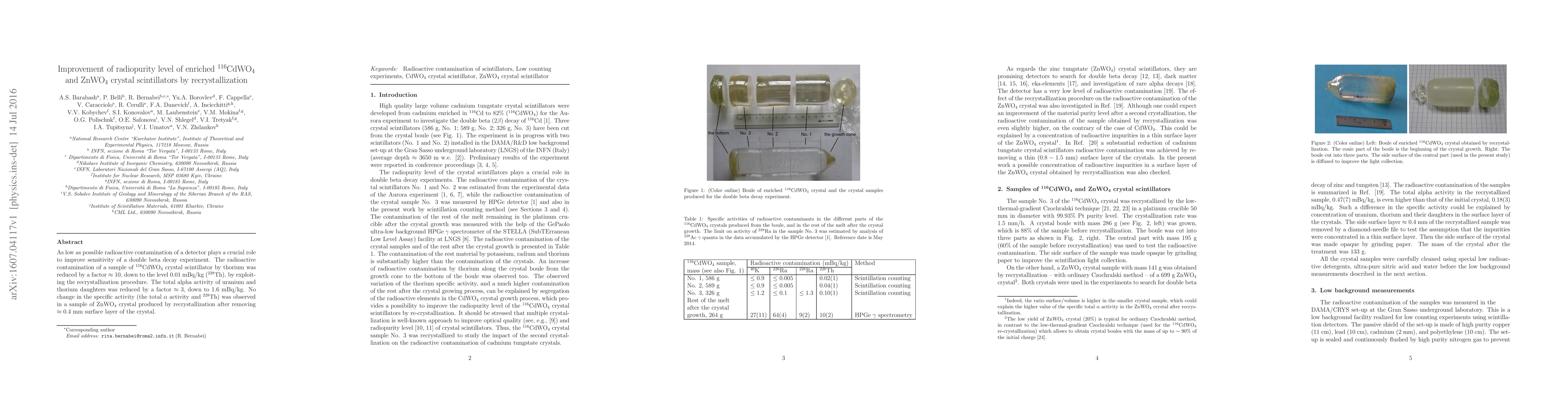 As low as possible radioactive contamination of a detector plays a crucial role to improve sensitivity of a double beta decay experiment. The radioactive contamination of a sample of $^{116}$CdWO$_4$ crystal scintillator by thorium was reduced by a factor $\approx 10$, down to the level 0.01 mBq/kg ($^{228}$Th), by exploiting the recrystallization procedure. The total alpha activity of uranium and thorium daughters was reduced by a factor $\approx 3$, down to 1.6 mBq/kg. No change in the specific activity (the total $\alpha$ activity and $^{228}$Th) was observed in a sample of ZnWO$_4$ crystal produced by recrystallization after removing $\approx 0.4$ mm surface layer of the crystal.