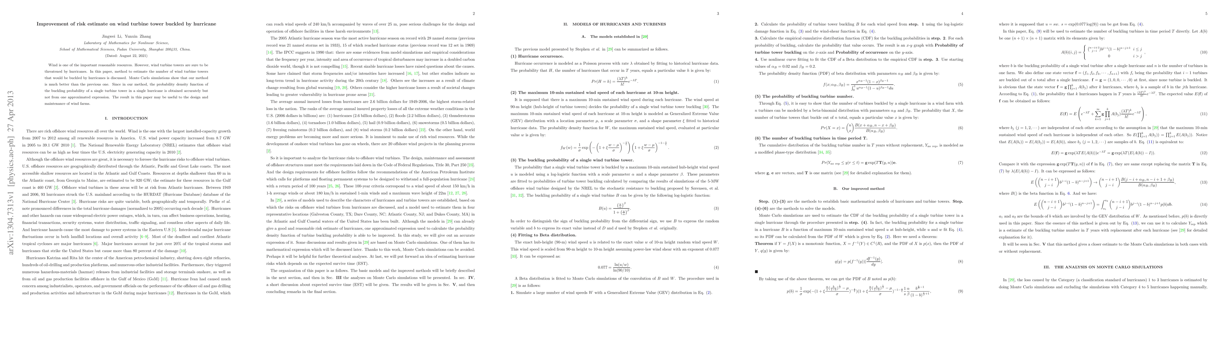 This paper proposes an improved method for estimating the number of wind turbine towers likely to buckle during hurricanes using Monte Carlo simulations, which provides a more accurate probability density function than previous methods. The findings can enhance the design and maintenance strategies for wind farms.