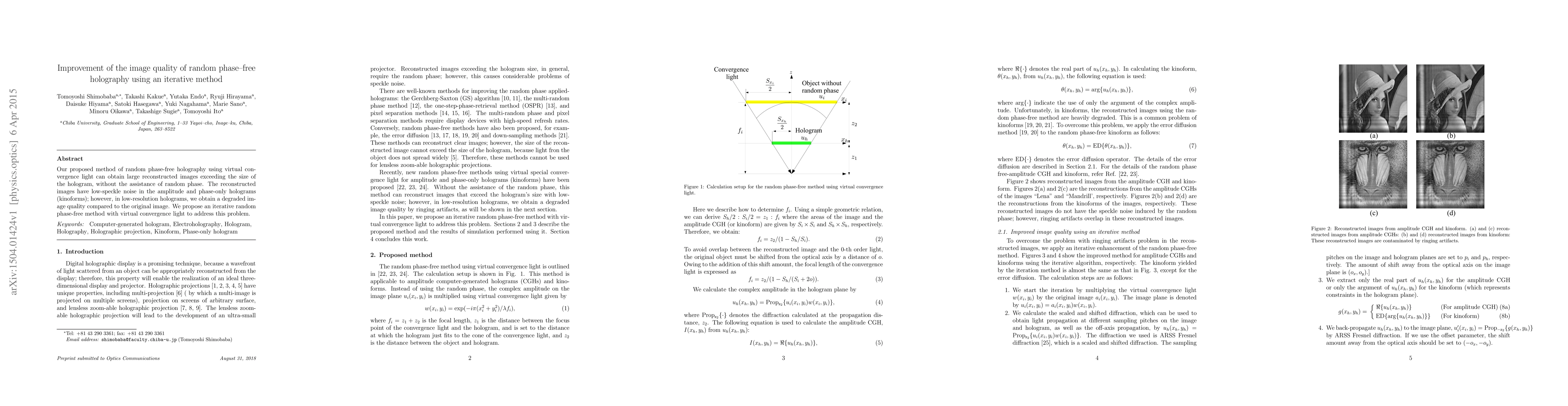 Our proposed method of random phase-free holography using virtual convergence light can obtain large reconstructed images exceeding the size of the hologram, without the assistance of random phase. The reconstructed images have low-speckle noise in the amplitude and phase-only holograms (kinoforms); however, in low-resolution holograms, we obtain a degraded image quality compared to the original image. We propose an iterative random phase-free method with virtual convergence light to address this problem.