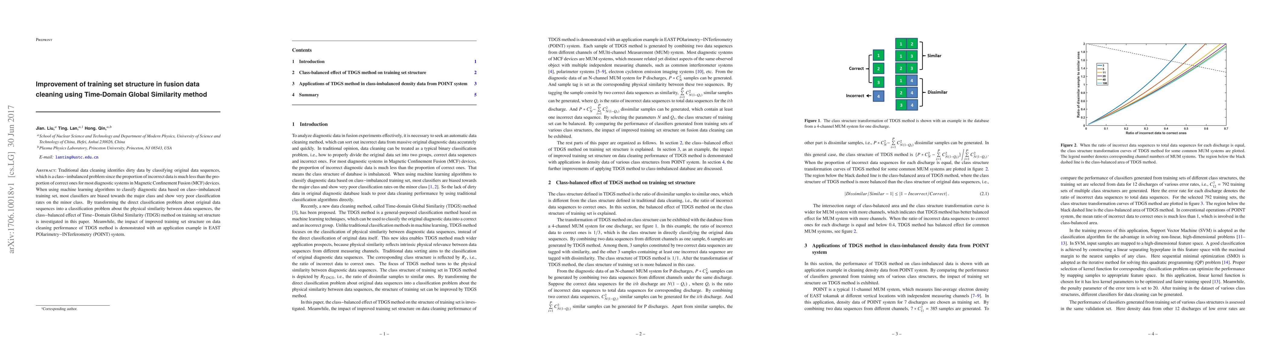 This paper explores the Time-Domain Global Similarity (TDGS) method to improve training set structure in fusion data cleaning, addressing the class imbalance issue in traditional data cleaning methods. It demonstrates the enhanced classification performance of TDGS through a practical application in the EAST POINT system.