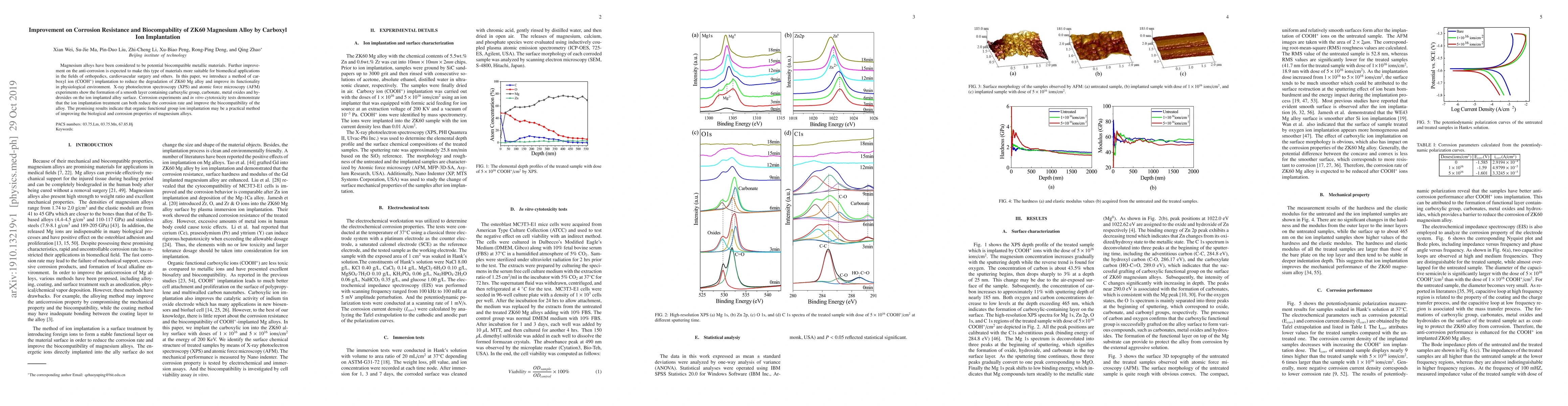 This study explores carboxyl ion implantation to enhance the corrosion resistance and biocompatibility of ZK60 magnesium alloy, revealing a smoother surface layer and improved corrosion rate and biocompatibility through XPS, AFM, and cytotoxicity tests.