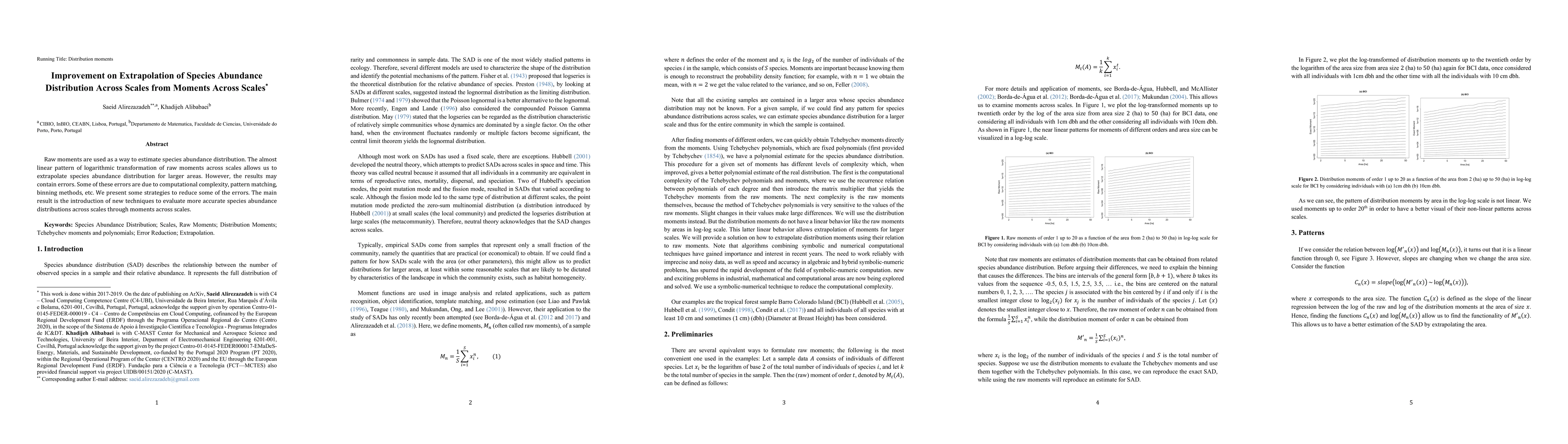 Raw moments are used as a way to estimate species abundance distribution. The almost linear pattern of the log transformation of raw moments across scales allow us to extrapolate species abundance distribution for larger areas. However, results may produce errors. Some of these errors are due to computational complexity, fittings of patterns, binning methods, and so on. We provide some methods to reduce some of the errors. The main result is introducing new techniques for evaluating a more accurate species abundance distributions across scales through moments across scales.