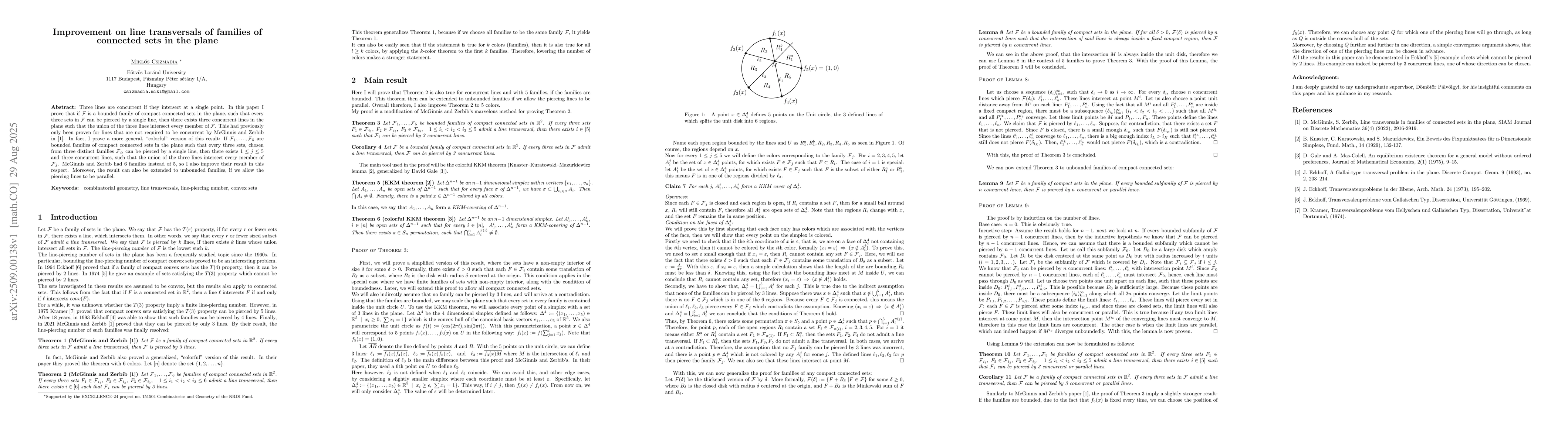 Three lines are concurrent if they intersect at a single point. In this paper I prove that if $F$ is a bounded family of compact connected sets in the plane, such that every three sets in $F$ can be pierced by a single line, then there exists three concurrent lines in the plane such that the union of the three lines intersect every member of $F$. This had previously only been proven for lines that are not required to be concurrent by McGinnis and Zerbib in arXiv:2103.05565v2. In fact, I prove a more general, ``colorful'' version of this result: If $F_1, \dots , F_5$ are bounded families of compact connected sets in the plane such that every three sets, chosen from three distinct families $F_i$, can be pierced by a single line, then there exists $1 \leq j \leq 5$ and three concurrent lines, such that the union of the three lines intersect every member of $F_j$. McGinnis and Zerbib had 6 families instead of 5, so I also improve their result in this respect. Moreover, the result can also be extended to unbounded families, if we allow the piercing lines to be parallel.