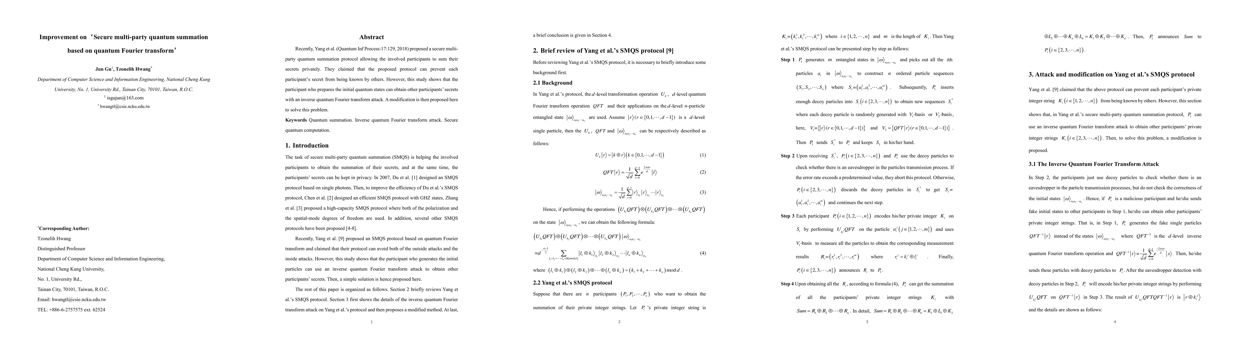 This paper identifies a vulnerability in Yang et al.'s secure multi-party quantum summation protocol, where the participant preparing the initial quantum states can exploit an inverse quantum Fourier transform attack to reveal others' secrets. A modified protocol is proposed to address this issue and enhance privacy protection.