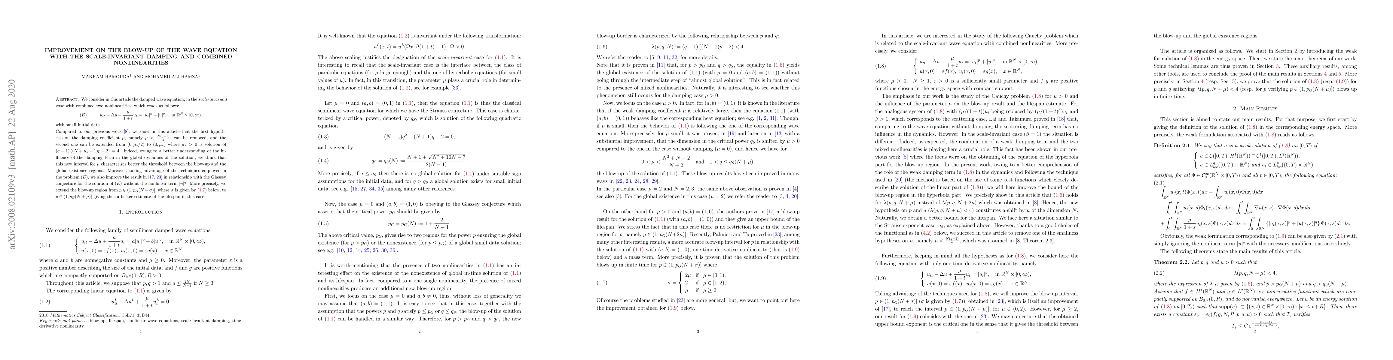 We consider in this article the damped wave equation, in the \textit{scale-invariant case} with combined two nonlinearities, which reads as follows: \begin{displaymath} \d (E) \hspace{1cm} u_{tt}-\Delta u+\frac{\mu}{1+t}u_t=|u_t|^p+|u|^q, \quad \mbox{in}\ \R^N\times[0,\infty), \end{displaymath} with small initial data.\\ Compared to our previous work \cite{Our}, we show in this article that the first hypothesis on the damping coefficient $\mu$, namely $\mu < \frac{N(q-1)}{2}$, can be removed, and the second one can be extended from $(0, \mu_*/2)$ to $(0, \mu_*)$ where $\mu_*>0$ is solution of $(q-1)\left((N+\mu_*-1)p-2\right) = 4$. Indeed, owing to a better understanding of the influence of the damping term in the global dynamics of the solution, we think that this new interval for $\mu$ describe better the threshold between the blow-up and the global existence regions. Moreover, taking advantage of the techniques employed in the problem $(E)$, we also improve the result in \cite{LT2,Palmieri} in relationship with the Glassey conjecture for the solution of $(E)$ but without the nonlinear term $|u|^q$. More precisely, we extend the blow-up region from $p \in (1, p_G(N+\sigma)]$, where $\sigma$ is given by \eqref{sigma} below, to $p \in (1, p_G(N+\mu)]$ giving thus a better estimate of the lifespan in this case.