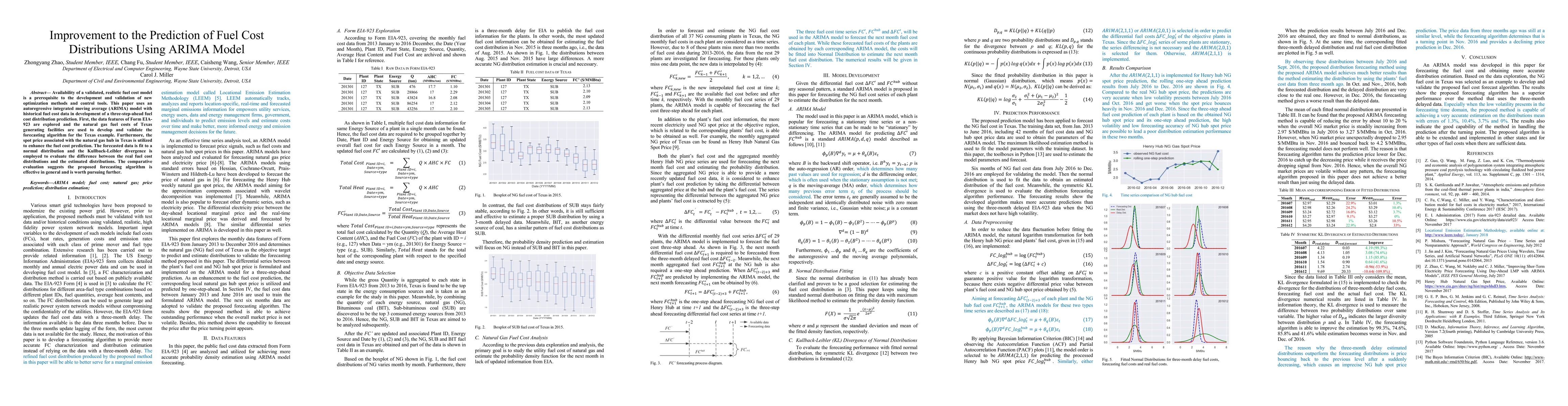 This paper develops an ARIMA model to predict three-step-ahead fuel cost distributions using historical natural gas data from Texas, enhancing predictions with spot price information. The model's effectiveness is validated by fitting forecasted data to a normal distribution and evaluating with Kullback-Leibler divergence.