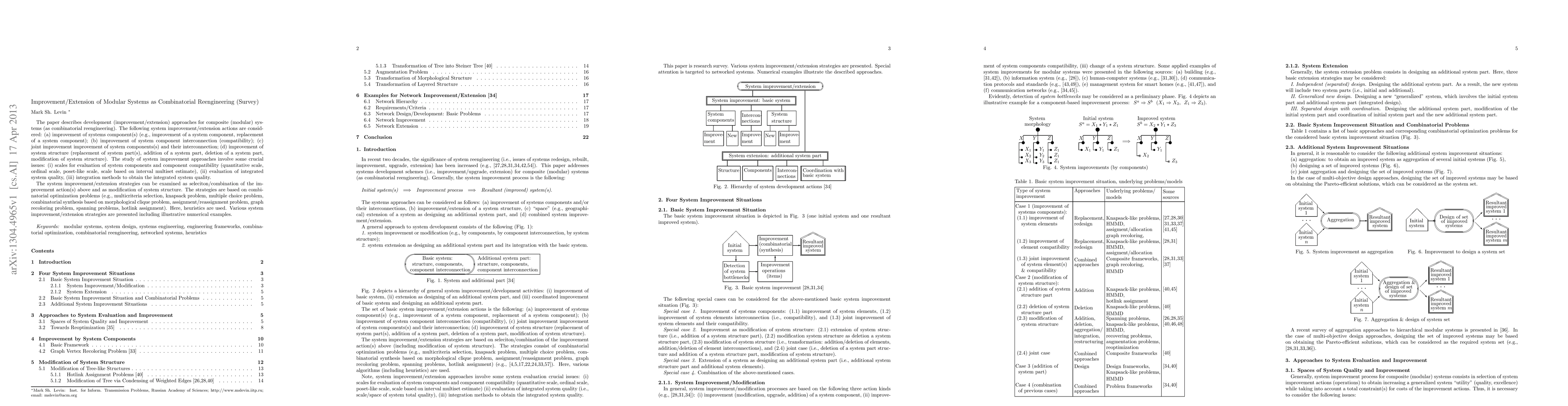 The paper describes development (improvement/extension) approaches for composite (modular) systems (as combinatorial reengineering). The following system improvement/extension actions are considered: (a) improvement of systems component(s) (e.g., improvement of a system component, replacement of a system component); (b) improvement of system component interconnection (compatibility); (c) joint improvement improvement of system components(s) and their interconnection; (d) improvement of system structure (replacement of system part(s), addition of a system part, deletion of a system part, modification of system structure). The study of system improvement approaches involve some crucial issues: (i) scales for evaluation of system components and component compatibility (quantitative scale, ordinal scale, poset-like scale, scale based on interval multiset estimate), (ii) evaluation of integrated system quality, (iii) integration methods to obtain the integrated system quality. The system improvement/extension strategies can be examined as seleciton/combination of the improvement action(s) above and as modification of system structure. The strategies are based on combinatorial optimization problems (e.g., multicriteria selection, knapsack problem, multiple choice problem, combinatorial synthesis based on morphological clique problem, assignment/reassignment problem, graph recoloring problem, spanning problems, hotlink assignment). Here, heuristics are used. Various system improvement/extension strategies are presented including illustrative numerical examples.