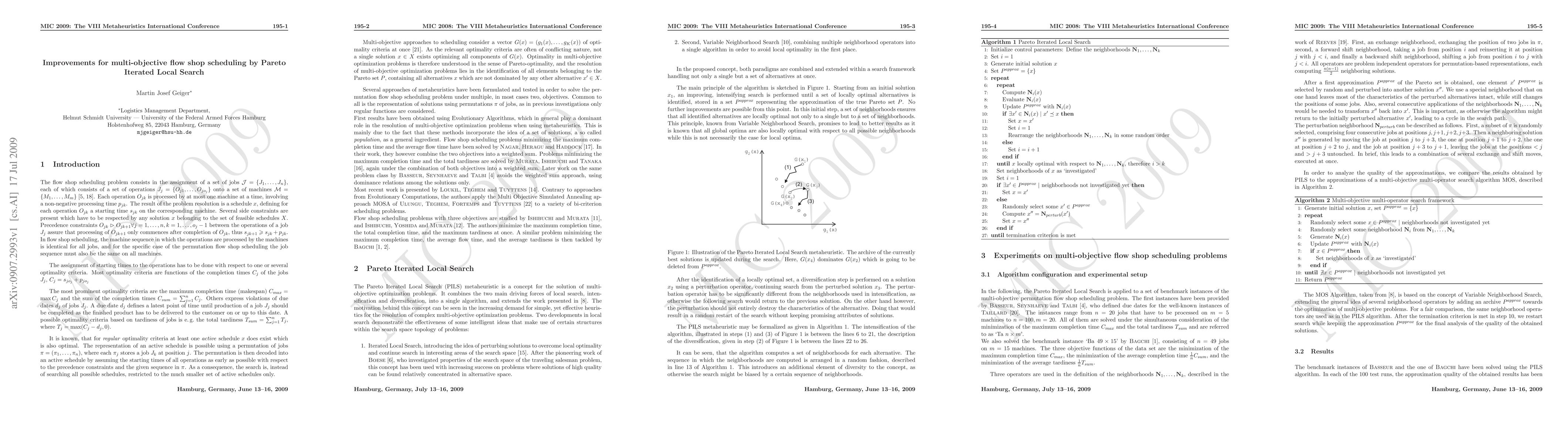 The article describes the proposition and application of a local search metaheuristic for multi-objective optimization problems. It is based on two main principles of heuristic search, intensification through variable neighborhoods, and diversification through perturbations and successive iterations in favorable regions of the search space. The concept is successfully tested on permutation flow shop scheduling problems under multiple objectives and compared to other local search approaches. While the obtained results are encouraging in terms of their quality, another positive attribute of the approach is its simplicity as it does require the setting of only very few parameters.