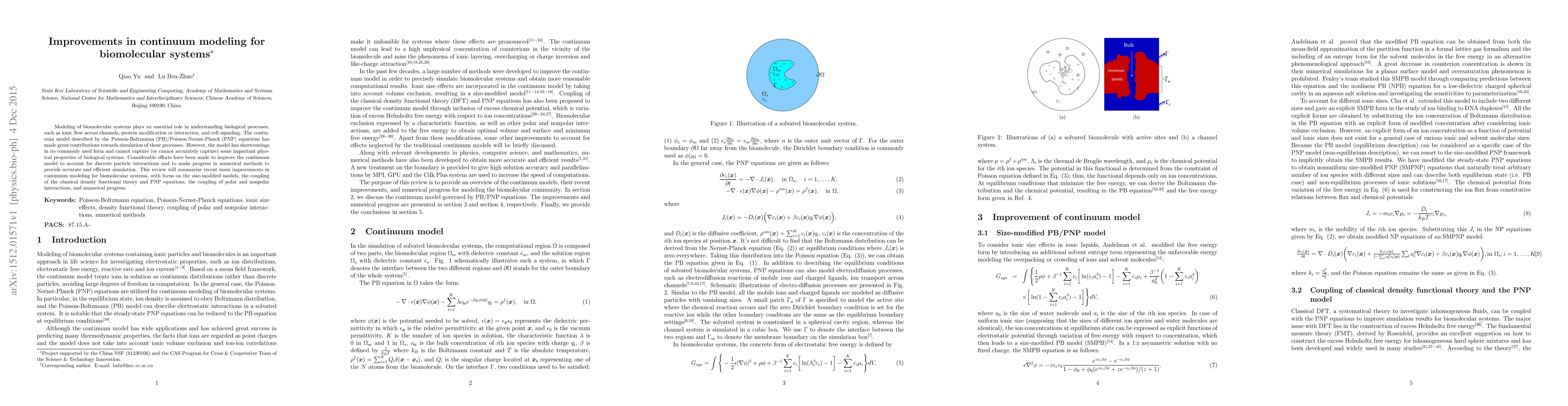 The paper presents various improvements in continuum modeling for biomolecular systems, including size-modified PB/PNP models, coupling of classical DFT and PNP equations, and methods to incorporate polar and nonpolar interactions.