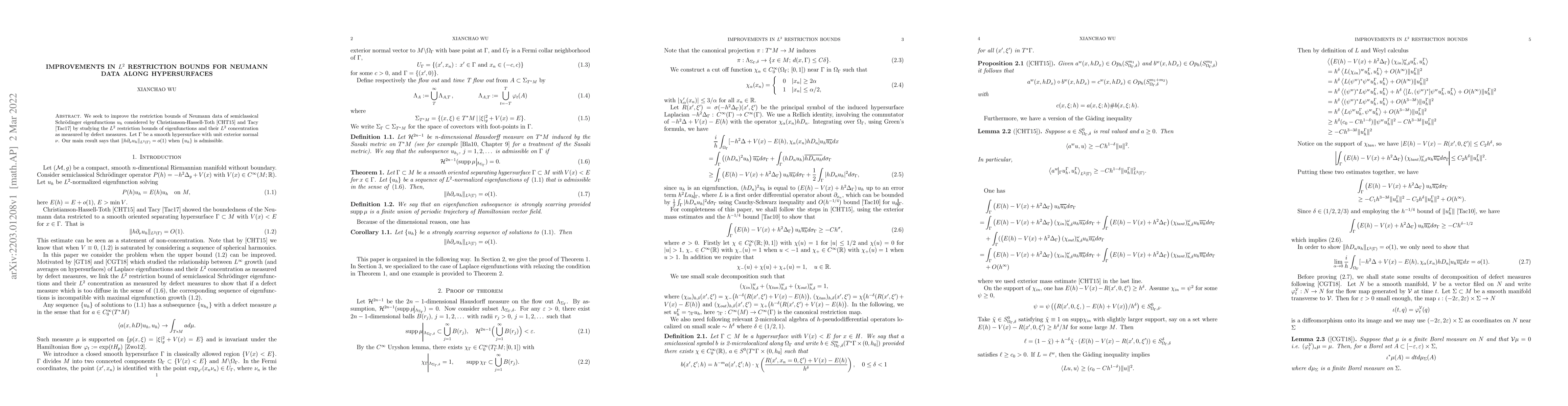We seek to improve the restriction bounds of Neumann data of semiclassical Schr\"{o}dinger eigenfunctions $u_h$ considered by Christianson-Hassell-Toth \cite{CHT} and Tacy \cite{Tacy2} by studying the $L^2$ restriction bounds of eigenfunctions and their $L^2$ concentration as measured by defect measures. Let $\Gamma$ be a smooth hypersurface with unit exterior normal $\nu$. Our main result says that $\| h \partial_\nu u_{h} \|_{L^2(\Gamma)}=o(1)$ when $\{u_h\}$ is admissible.