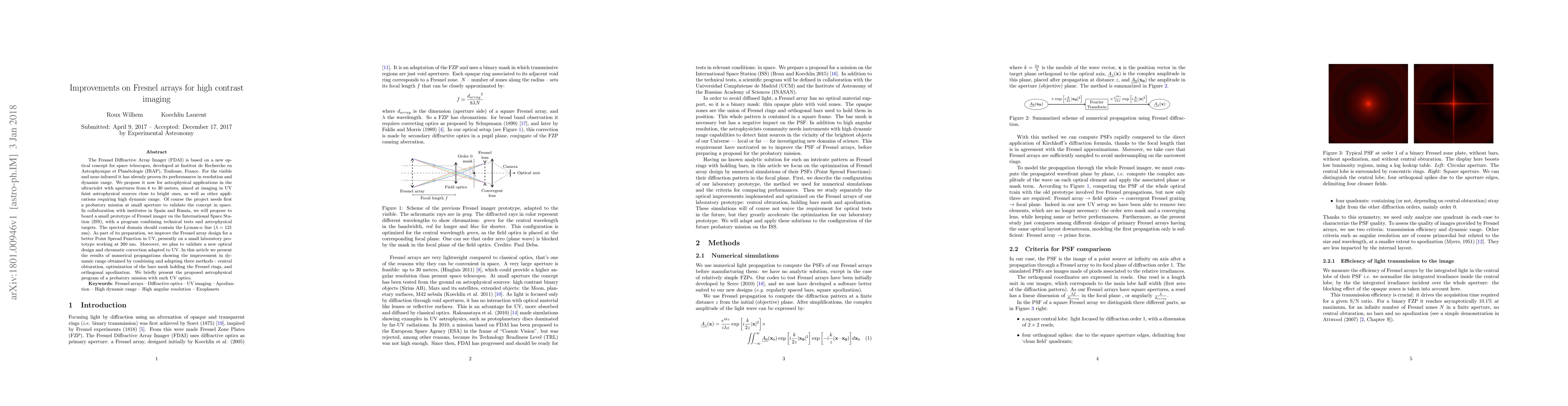 The Fresnel Diffractive Array Imager (FDAI) is based on a new optical concept for space telescopes, developed at Institut de Recherche en Astrophysique et Plan\'etologie (IRAP), Toulouse, France. For the visible and near-infrared it has already proven its performances in resolution and dynamic range. We propose it now for astrophysical applications in the ultraviolet with apertures from 6 to 30 meters, aimed at imaging in UV faint astrophysical sources close to bright ones, as well as other applications requiring high dynamic range. Of course the project needs first a probatory mission at small aperture to validate the concept in space. In collaboration with institutes in Spain and Russia, we will propose to board a small prototype of Fresnel imager on the International Space Station (ISS), with a program combining technical tests and astrophysical targets. The spectral domain should contain the Lyman-$\alpha$ line ($\lambda= 121$ nm). As part of its preparation, we improve the Fresnel array design for a better Point Spread Function in UV, presently on a small laboratory prototype working at 260 nm. Moreover, we plan to validate a new optical design and chromatic correction adapted to UV. In this article we present the results of numerical propagations showing the improvement in dynamic range obtained by combining and adapting three methods : central obturation, optimization of the bars mesh holding the Fresnel rings, and orthogonal apodization. We briefly present the proposed astrophysical program of a probatory mission with such UV optics. Keywords: Fresnel arrays -- Diffractive optics -- UV imaging -- Apodization -- High dynamic range -- High angular resolution -- Exoplanets