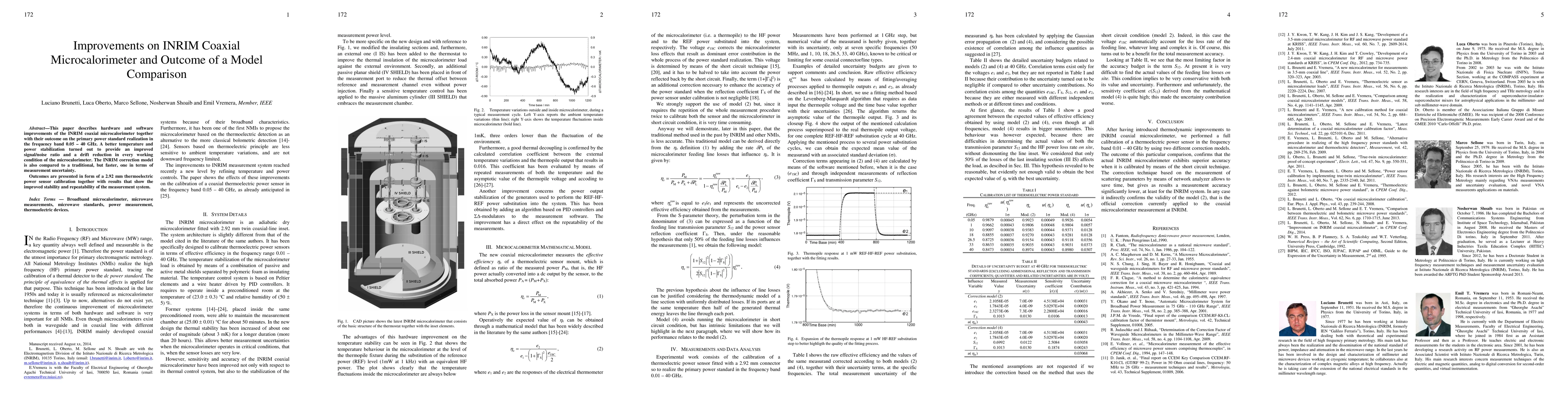 This paper details enhancements to the INRIM coaxial microcalorimeter, including improved hardware and software, which enhance signal/noise ratio and reduce drift. A comparative analysis of the INRIM correction model against a traditional model shows improved measurement stability and repeatability, demonstrated through a 2.92 mm thermoelectric power sensor calibration.