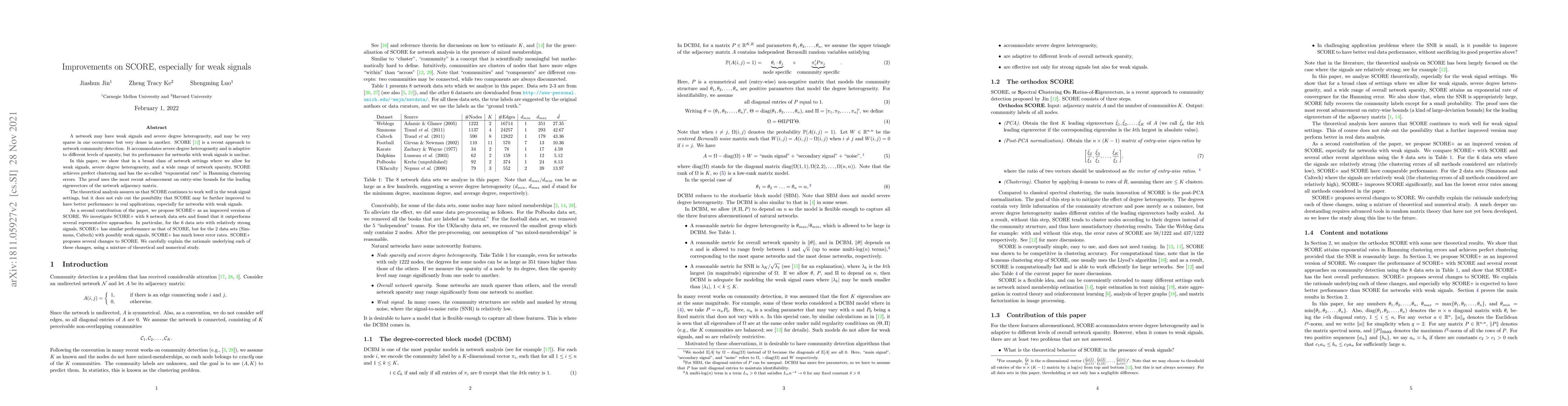 A network may have weak signals and severe degree heterogeneity, and may be very sparse in one occurrence but very dense in another. SCORE (Jin, 2015) is a recent approach to network community detection. It accommodates severe degree heterogeneity and is adaptive to different levels of sparsity, but its performance for networks with weak signals is unclear. In this paper, we show that in a broad class of network settings where we allow for weak signals, severe degree heterogeneity, and a wide range of network sparsity, SCORE achieves prefect clustering and has the so-called "exponential rate" in Hamming clustering errors. The proof uses the most recent advancement on entry-wise bounds for the leading eigenvectors of the network adjacency matrix. The theoretical analysis assures us that SCORE continues to work well in the weak signal settings, but it does not rule out the possibility that SCORE may be further improved to have better performance in real applications, especially for networks with weak signals. As a second contribution of the paper, we propose SCORE+ as an improved version of SCORE. We investigate SCORE+ with 8 network data sets and found that it outperforms several representative approaches. In particular, for the 6 data sets with relatively strong signals, SCORE+ has similar performance as that of SCORE, but for the 2 data sets (Simmons, Caltech) with possibly weak signals, SCORE+ has much lower error rates. SCORE+ proposes several changes to SCORE. We carefully explain the rationale underlying each of these changes, using a mixture of theoretical and numerical study.