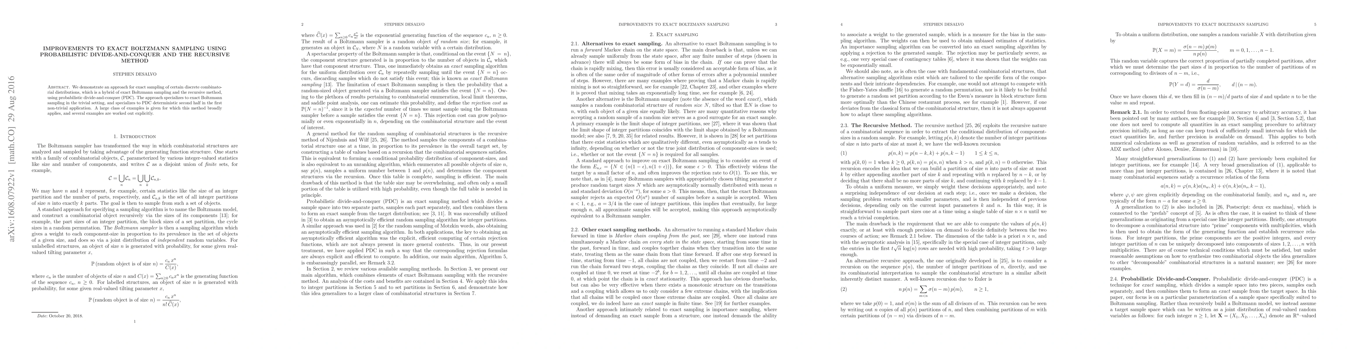 This paper presents a hybrid method combining exact Boltzmann sampling with probabilistic divide-and-conquer and recursive techniques for sampling discrete combinatorial distributions. The method is shown to broadly apply to a large class of examples, with explicit examples demonstrating its effectiveness.
