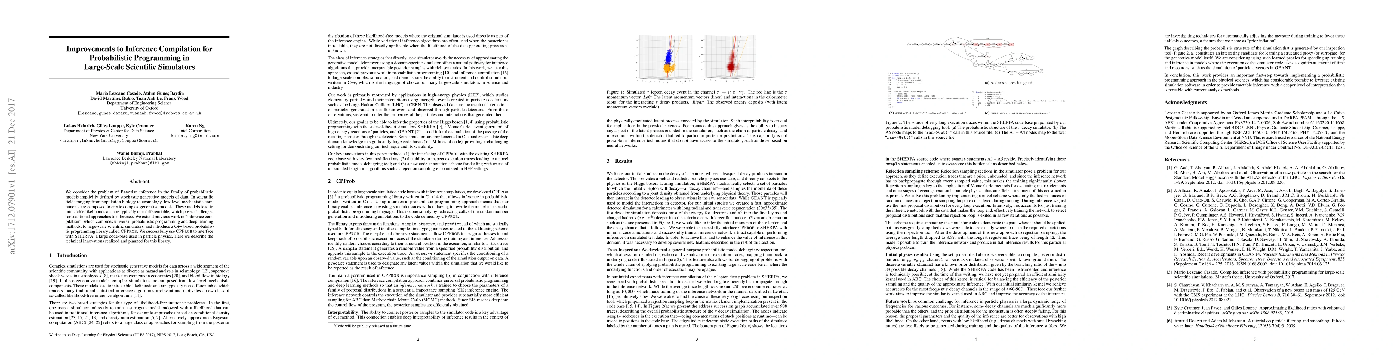 We consider the problem of Bayesian inference in the family of probabilistic models implicitly defined by stochastic generative models of data. In scientific fields ranging from population biology to cosmology, low-level mechanistic components are composed to create complex generative models. These models lead to intractable likelihoods and are typically non-differentiable, which poses challenges for traditional approaches to inference. We extend previous work in "inference compilation", which combines universal probabilistic programming and deep learning methods, to large-scale scientific simulators, and introduce a C++ based probabilistic programming library called CPProb. We successfully use CPProb to interface with SHERPA, a large code-base used in particle physics. Here we describe the technical innovations realized and planned for this library.