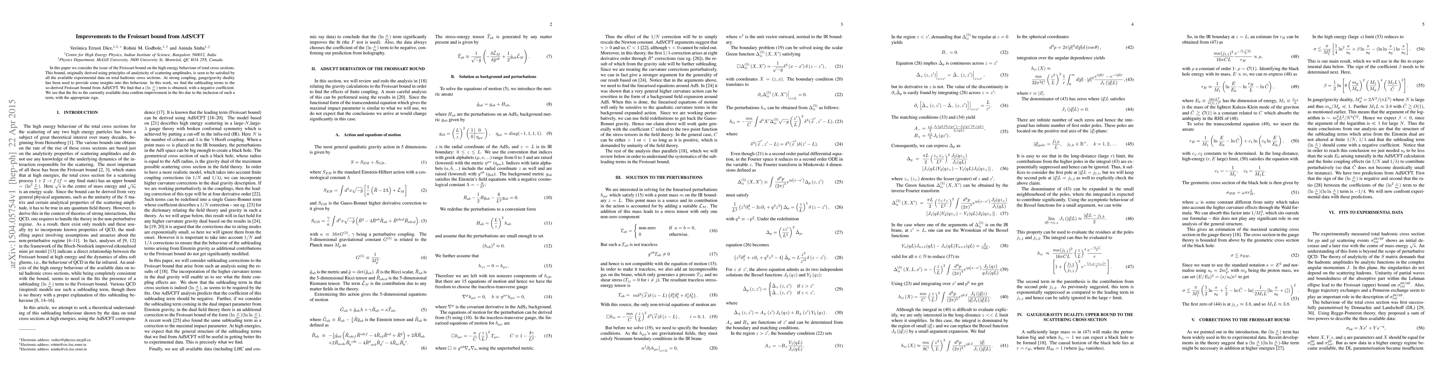 In this paper we consider the issue of the Froissart bound on the high energy behaviour of total cross sections. This bound, originally derived using principles of analyticity of scattering amplitudes, is seen to be satisfied by all the available experimental data on total hadronic cross sections. At strong coupling, gauge/gravity duality has been used to provide some insights into this behaviour. In this work, we find the subleading terms to the so-derived Froissart bound from AdS/CFT. We find that a $(\ln \frac{s}{s_0})$ term is obtained, with a negative coefficient. We see that the fits to the currently available data confirm improvement in the fits due to the inclusion of such a term, with the appropriate sign.