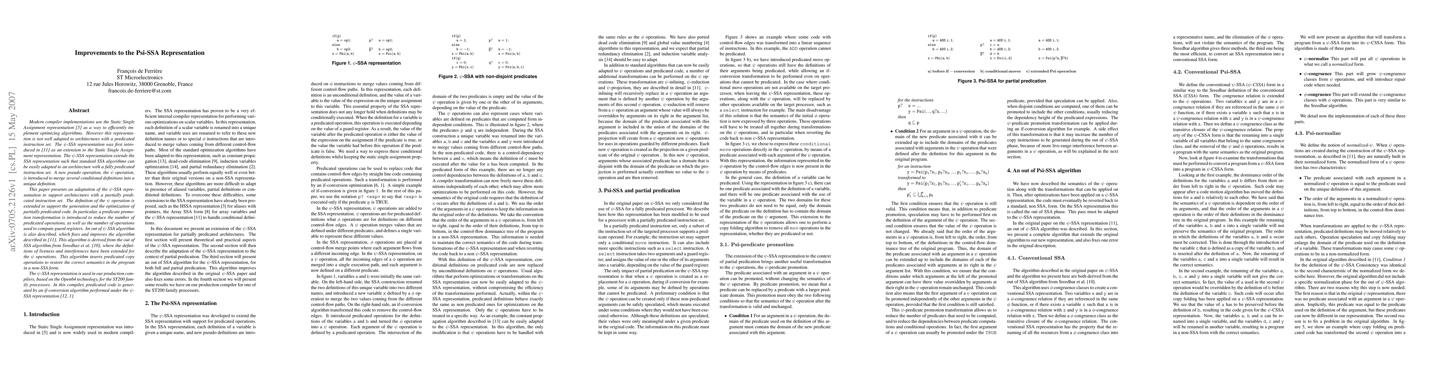 Modern compiler implementations use the Static Single Assignment representation as a way to efficiently implement optimizing algorithms. However this representation is not well adapted to architectures with a predicated instruction set. The Psi-SSA representation extends the SSA representation such that standard SSA algorithms can be easily adapted to an architecture with a fully predicated instruction set. A new pseudo operation, the Psi operation, is introduced to merge several conditional definitions into a unique definition.