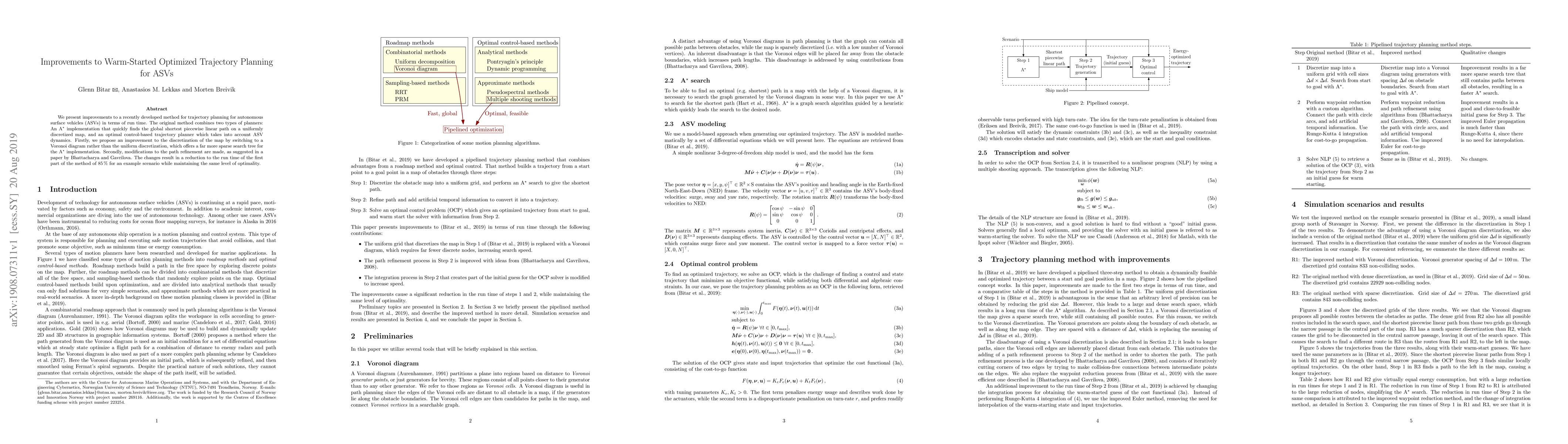 We present improvements to a recently developed method for trajectory planning for autonomous surface vehicles (ASVs) in terms of run time. The original method combines two types of planners: An A* implementation that quickly finds the global shortest piecewise linear path on a uniformly discretized map, and an optimal control-based trajectory planner which takes into account ASV dynamics. Firstly, we propose an improvement to the discretization of the map by switching to a Voronoi diagram rather than the uniform discretization, which offers a far more sparse search tree for the A* implementation. Secondly, modifications to the path refinement are made, as suggested in a paper by Bhattacharya and Gavrilova. The changes result in a reduction to the run time of the first part of the method of 85% for an example scenario while maintaining the same level of optimality.