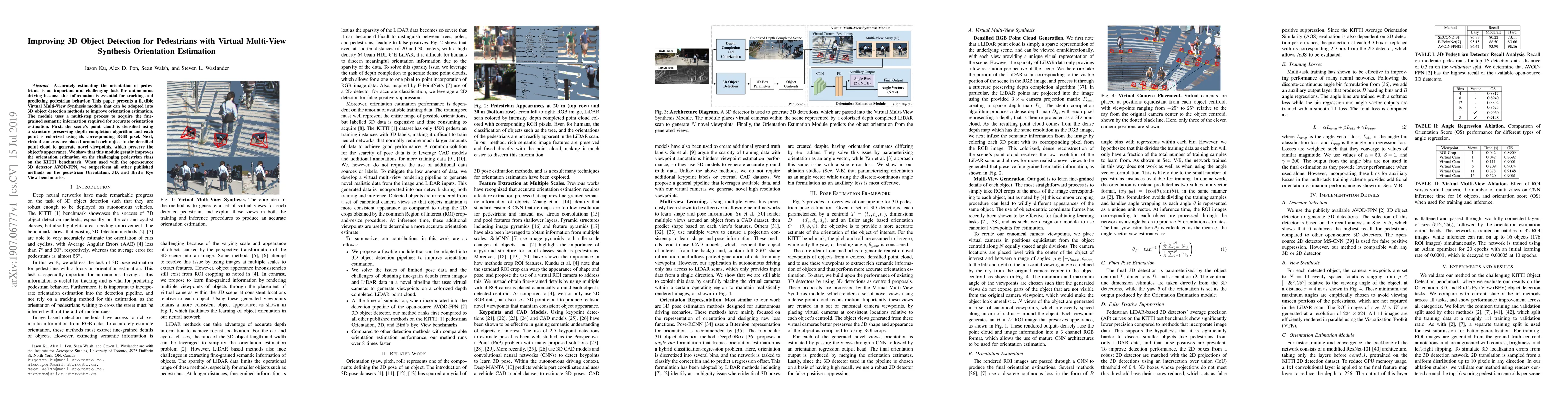Accurately estimating the orientation of pedestrians is an important and challenging task for autonomous driving because this information is essential for tracking and predicting pedestrian behavior. This paper presents a flexible Virtual Multi-View Synthesis module that can be adopted into 3D object detection methods to improve orientation estimation. The module uses a multi-step process to acquire the fine-grained semantic information required for accurate orientation estimation. First, the scene's point cloud is densified using a structure preserving depth completion algorithm and each point is colorized using its corresponding RGB pixel. Next, virtual cameras are placed around each object in the densified point cloud to generate novel viewpoints, which preserve the object's appearance. We show that this module greatly improves the orientation estimation on the challenging pedestrian class on the KITTI benchmark. When used with the open-source 3D detector AVOD-FPN, we outperform all other published methods on the pedestrian Orientation, 3D, and Bird's Eye View benchmarks.