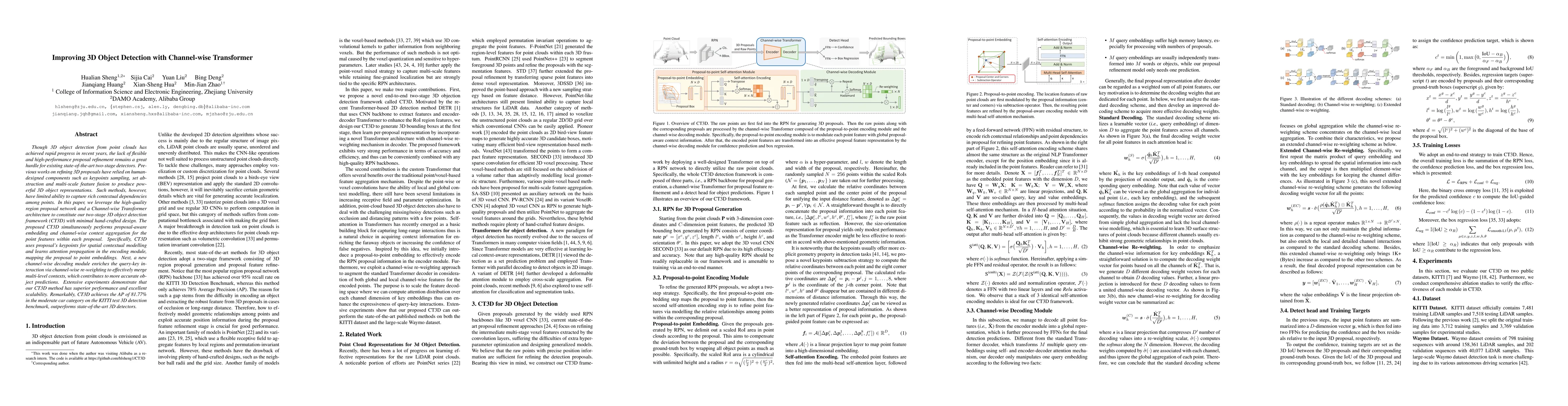 This paper introduces CT3D, a two-stage 3D object detection framework that uses a Channel-wise Transformer to refine 3D proposals without extensive hand-crafted design. The proposed method achieves superior performance by combining proposal-aware embedding and channel-wise context aggregation, outperforming existing state-of-the-art detectors on the KITTI benchmark.