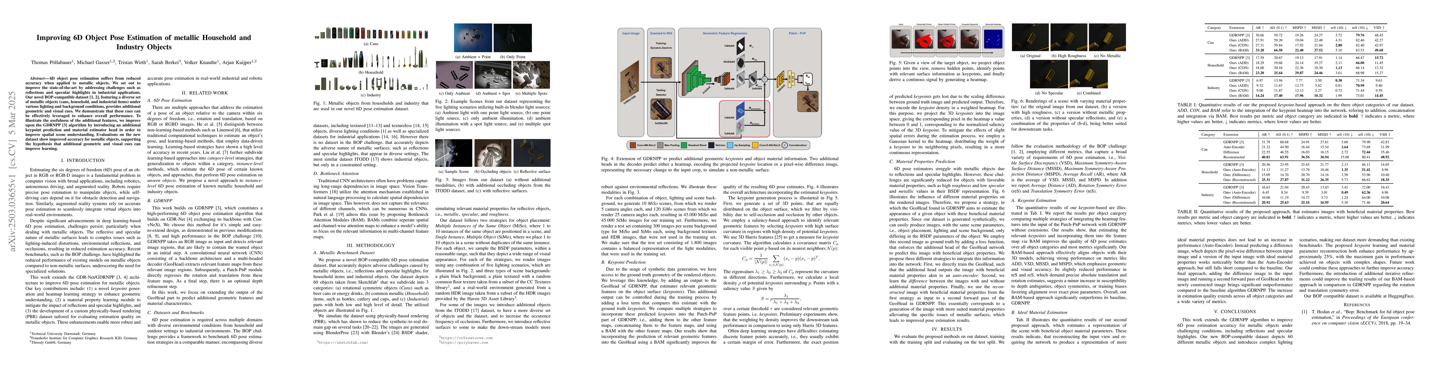 This paper introduces a new dataset for metallic object pose estimation, addressing challenges like reflections and specular highlights. The authors enhance the GDRNPP algorithm with a keypoint prediction and material estimator to leverage additional geometric and visual cues, resulting in improved accuracy for metallic objects in industrial applications.
