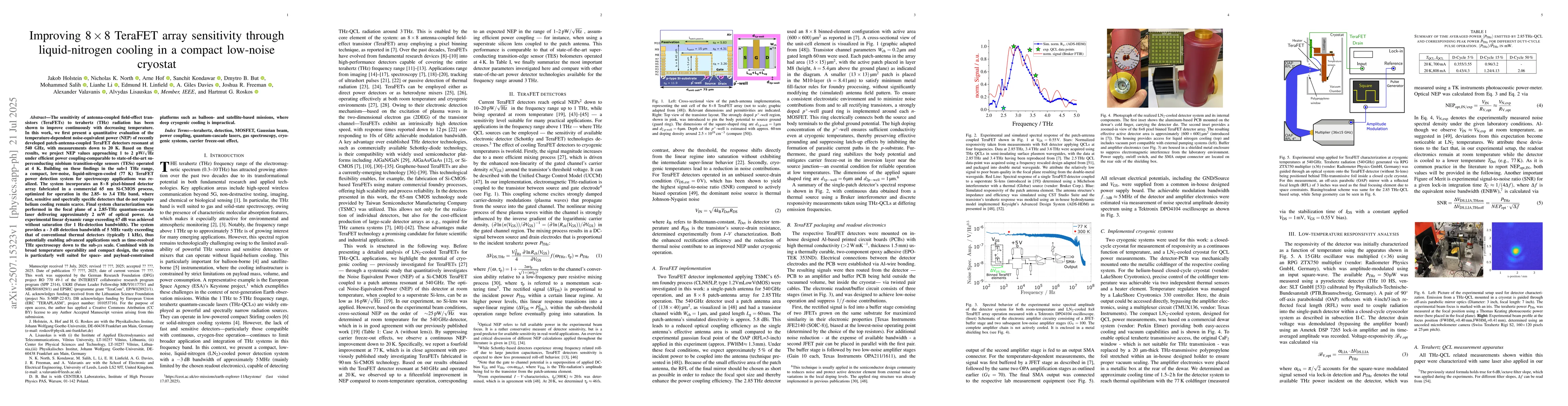 The sensitivity of antenna-coupled field-effect transistors (TeraFETs) to terahertz (THz) radiation has been shown to improve continuously with decreasing temperature. In this work, we first present a quantitative evaluation of the temperature-dependent noise-equivalent power (NEP) of recently developed patch-antenna-coupled TeraFET detectors resonant at 540 GHz, with measurements down to 20 K. Based on these results, we project NEP values approaching 1 to 2 pW/$\sqrt{\textrm{Hz}}$ under efficient power coupling-comparable to state-of-the-art superconducting niobium transition-edge sensors (TESs) operated at 4 K. Building on these findings in the sub-1 THz range, a compact, low-noise, liquid-nitrogen-cooled (77 K) TeraFET power detection system for spectroscopy applications was realized. The system incorporates an 8$\times$8 pixel-binned detector array fabricated in a commercial 65 nm Si-CMOS process, optimized for operation in the 2.85- to 3.4 THz band, where fast, sensitive and spectrally specific detectors that do not require helium cooling remain scarce. Final system characterization was performed in the focal plane of a 2.85-THz quantum-cascade laser delivering approximately 2 mW of optical power. An experimental linear dynamic range exceeding 67 dB was achieved without saturation (for 1 Hz-detection bandwidth). The system provides a -3 dB detection bandwidth of 5 MHz vastly exceeding that of conventional thermal detectors (typically 1-kHz), thus potentially enabling advanced applications such as time-resolved THz spectroscopy down to the sub-$\mu$s scale. Combined with its broad temperature operability and compact design, the system is particularly well suited for space- and payload-constrained platforms such as balloon- and satellite-based missions, where deep cryogenic cooling is impractical.