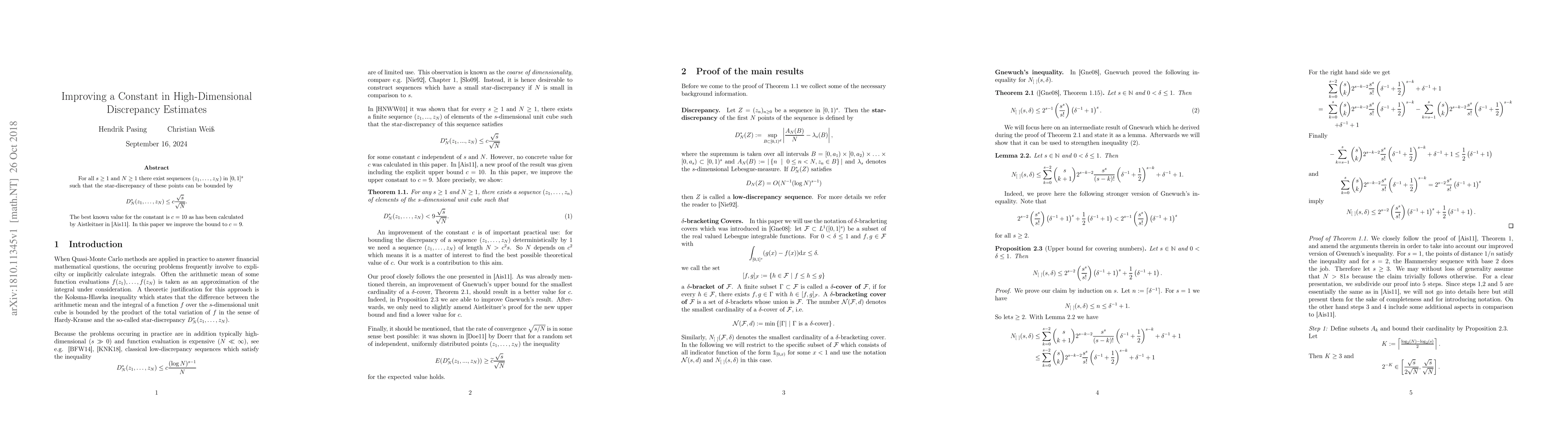 For all $s \geq 1$ and $N \geq 1$ there exist sequences $(z_1,\ldots,z_N)$ in $[0,1]^s$ such that the star-discrepancy of these points can be bounded by $$D_N^*(z_1,\ldots,z_N) \leq c \frac{\sqrt{s}}{\sqrt{N}}.$$ The best known value for the constant is $c=10$ as has been calculated by Aistleitner in \cite{Ais11}. In this paper we improve the bound to $c=9$.