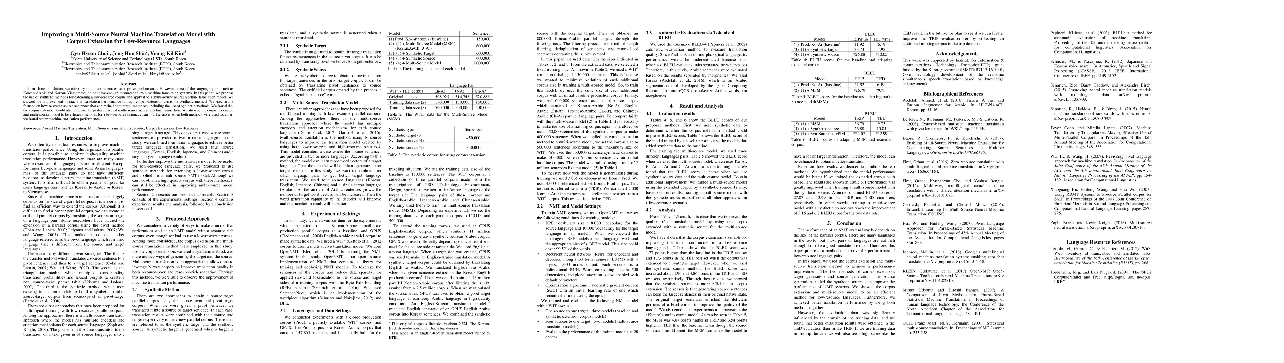 This paper proposes using synthetic methods to extend low-resource corpora for multi-source neural machine translation models, demonstrating improved translation performance for language pairs like Korean-Arabic and Korean-Vietnamese. Combining corpus extension with synthetic methods further enhances translation quality.