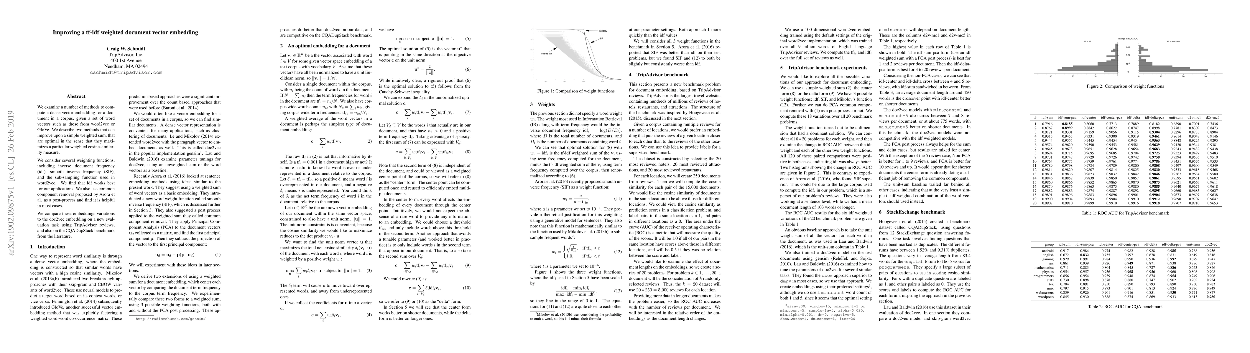 We examine a number of methods to compute a dense vector embedding for a document in a corpus, given a set of word vectors such as those from word2vec or GloVe. We describe two methods that can improve upon a simple weighted sum, that are optimal in the sense that they maximizes a particular weighted cosine similarity measure. We consider several weighting functions, including inverse document frequency (idf), smooth inverse frequency (SIF), and the sub-sampling function used in word2vec. We find that idf works best for our applications. We also use common component removal proposed by Arora et al. as a post-process and find it is helpful in most cases. We compare these embeddings variations to the doc2vec embedding on a new evaluation task using TripAdvisor reviews, and also on the CQADupStack benchmark from the literature.
