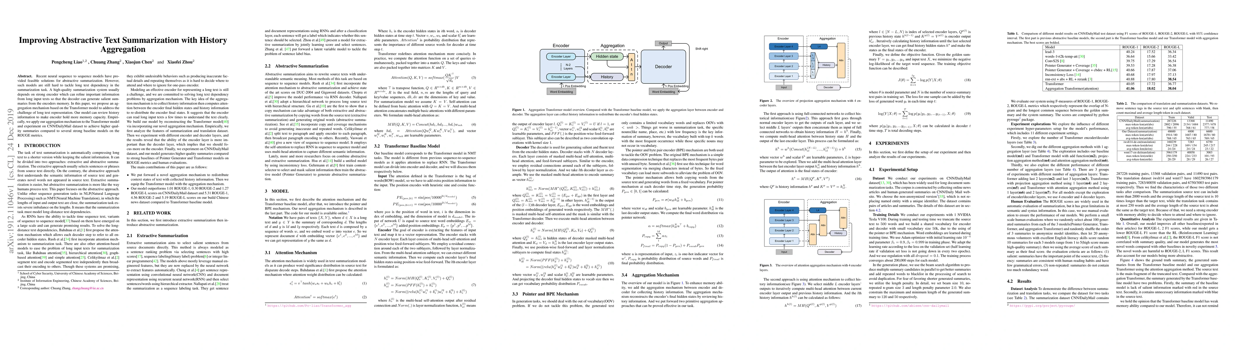 This paper proposes an aggregation mechanism within the Transformer model to enhance abstractive text summarization by improving the encoder's memory capacity to handle long text dependencies. Experiments on the CNN/DailyMail dataset show that this approach outperforms several baseline models in generating higher quality summaries, as measured by ROUGE metrics.