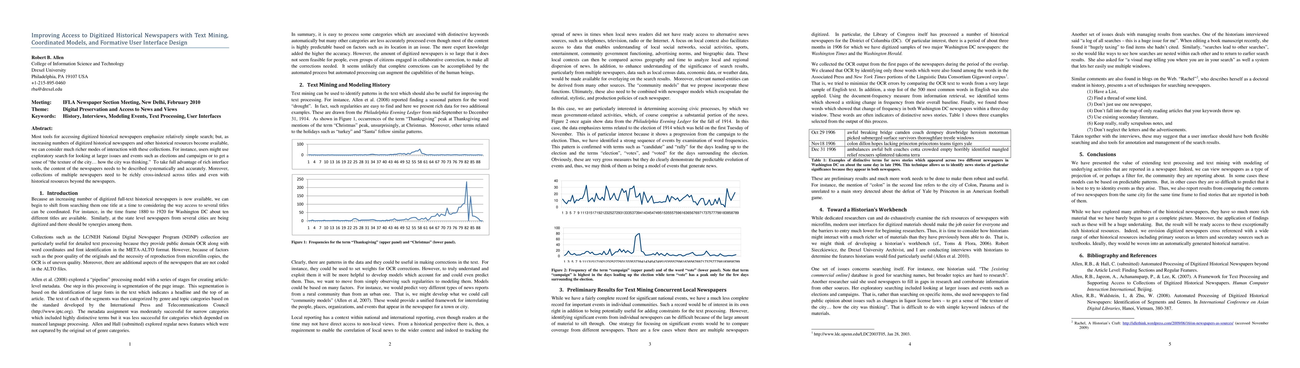This paper explores advanced methods for accessing digitized historical newspapers through text mining, coordinated models, and user interface design to enable richer exploratory search experiences. It emphasizes systematic content description and cross-indexing to facilitate comprehensive interaction with historical collections.